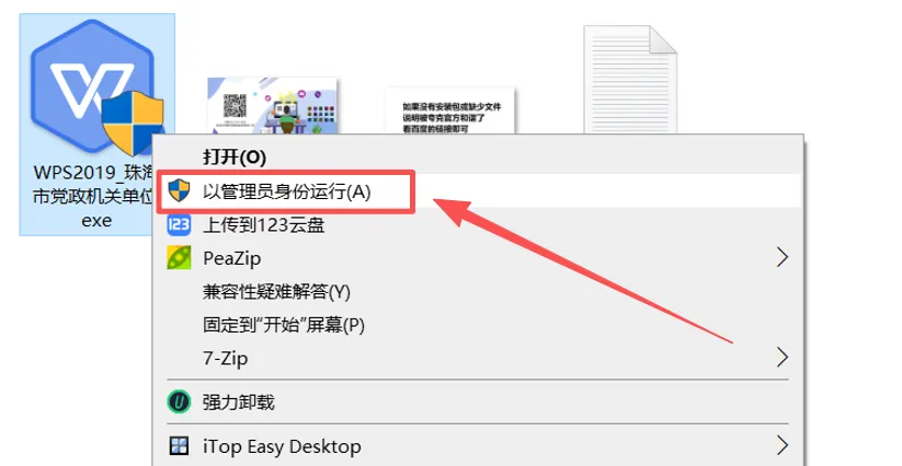 2.打开刚刚解压好的文件夹,找到【W-P–S2019_珠海市党政机关单位.exe】,鼠标右键选择【以管理员身份运行】。