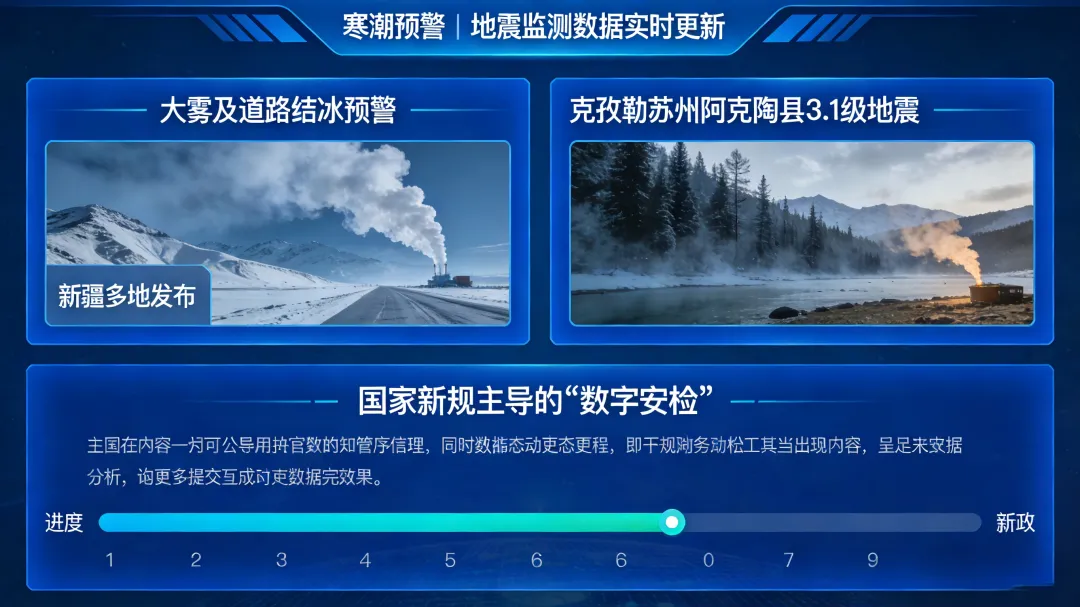 寒潮预警与地震监测数据实时更新的同时,新疆政务APP正经历一场由国家新规主导的“数字安检”。今天上午,新疆多地发布大雾及道路结冰预警,几乎同一时间,克孜勒苏州阿克陶县发生3.1级地震。在这个多事之晨,一项关乎每个人数字安全的新政正在悄然落地。