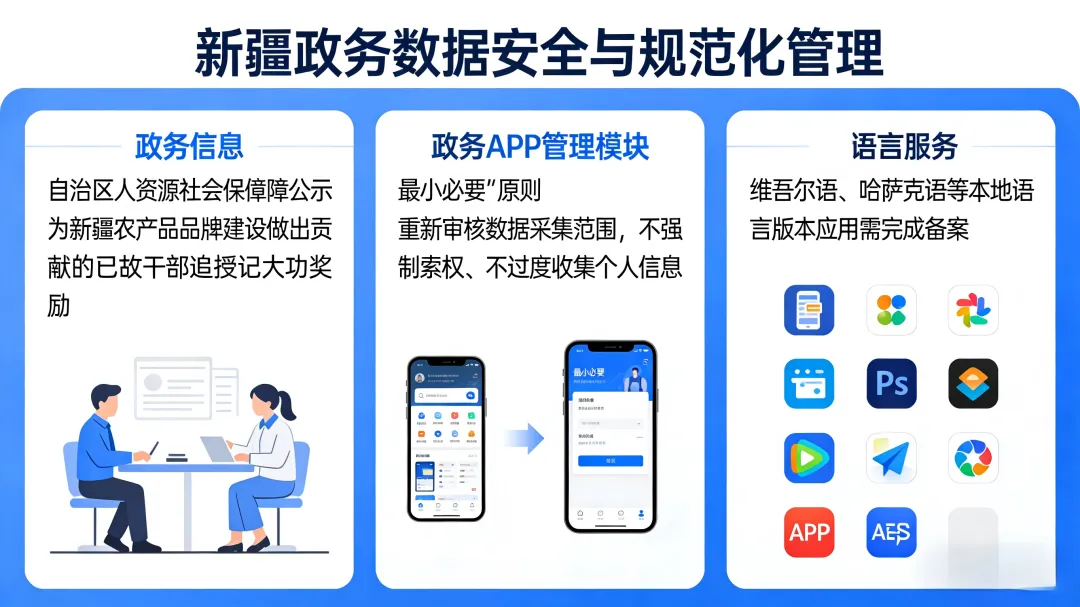 这种对政务工作规范化的重视同样体现在政务APP管理上。新疆各地政务APP主办单位正按照“最小必要”原则重新审核数据采集范围,确保不强制索权、不过度收集个人信息。