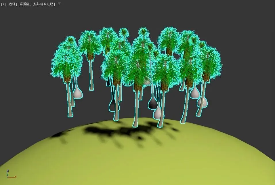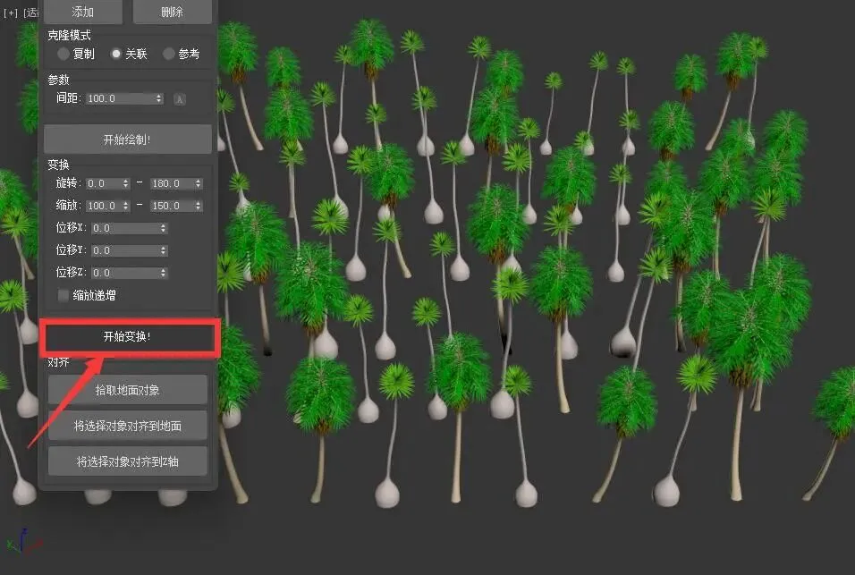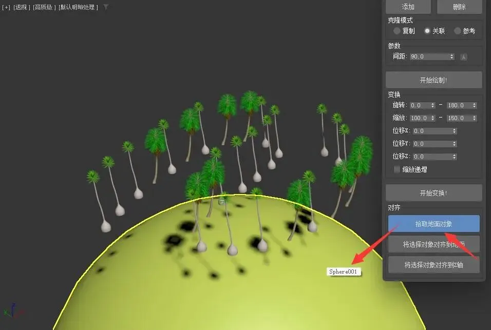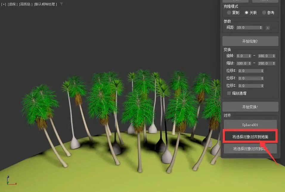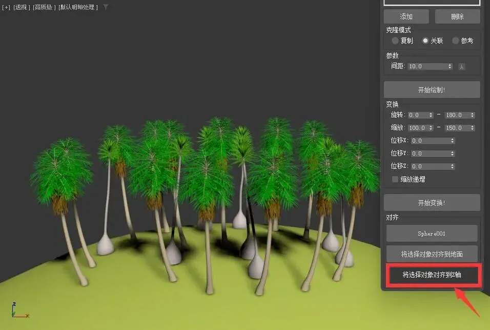 选择球体上方的所有树木对象,点击“将选择对象对齐到Z轴”按钮,完成树木与世界坐标的Z轴对齐,如图:
