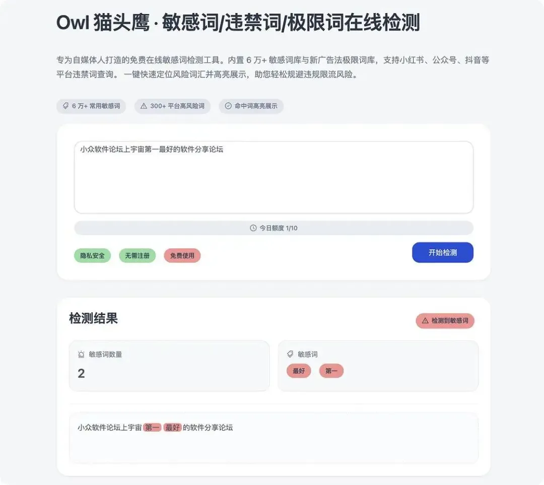 一款在线文本检测服务,用于快速检查文章中是否包含敏感或高风险词汇,常用于内容发布前的自查。