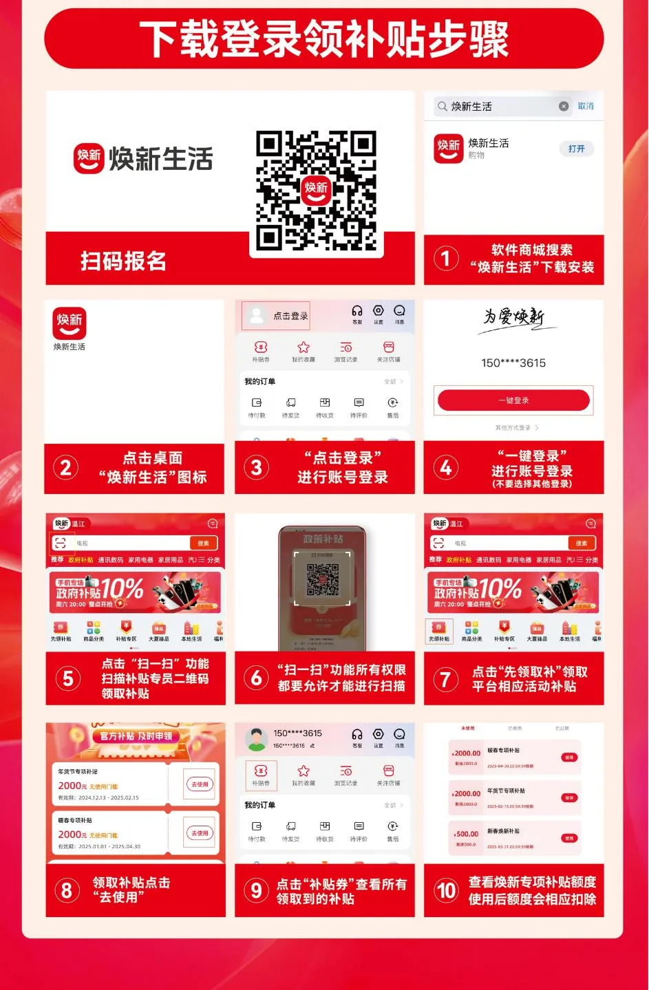 下载“焕新生活”APP→注册登录→扫描二维码→领取补贴。