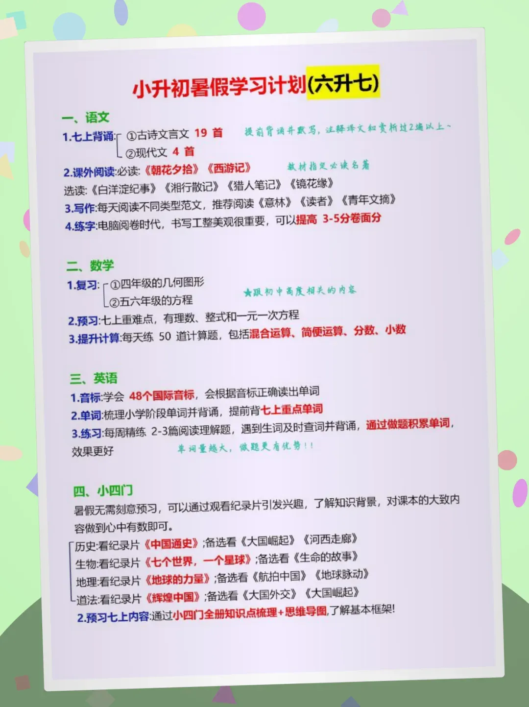 #小升初 #暑假学习计划 #小学升初中 #语文学习 #数学预习 #英语启蒙 #学习习惯培养 #家长必备资料