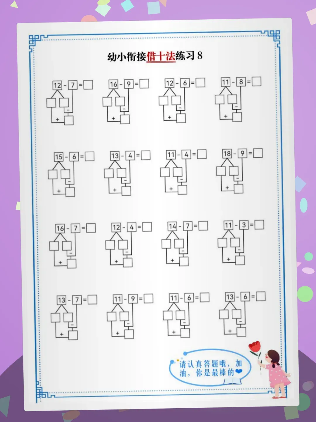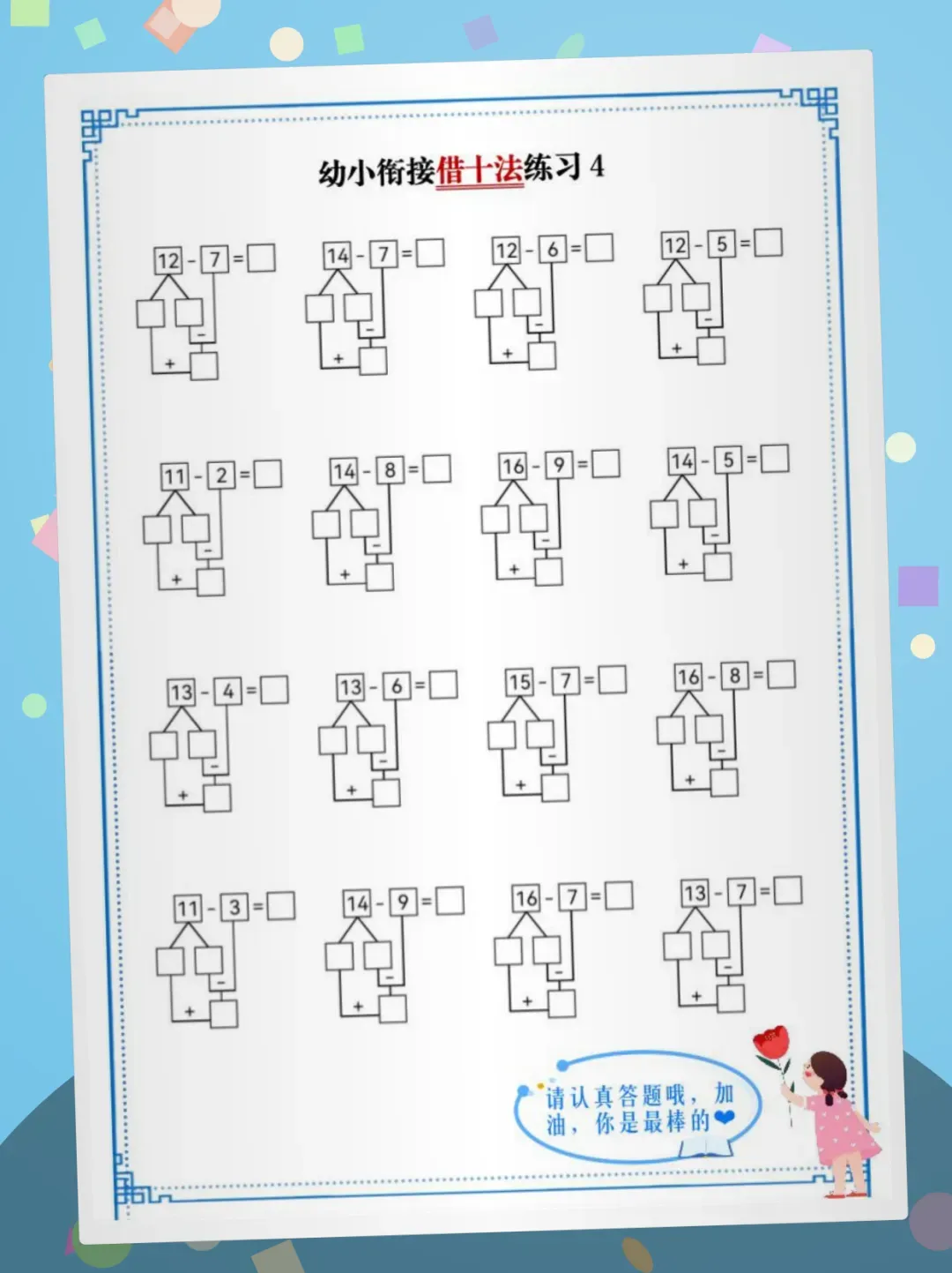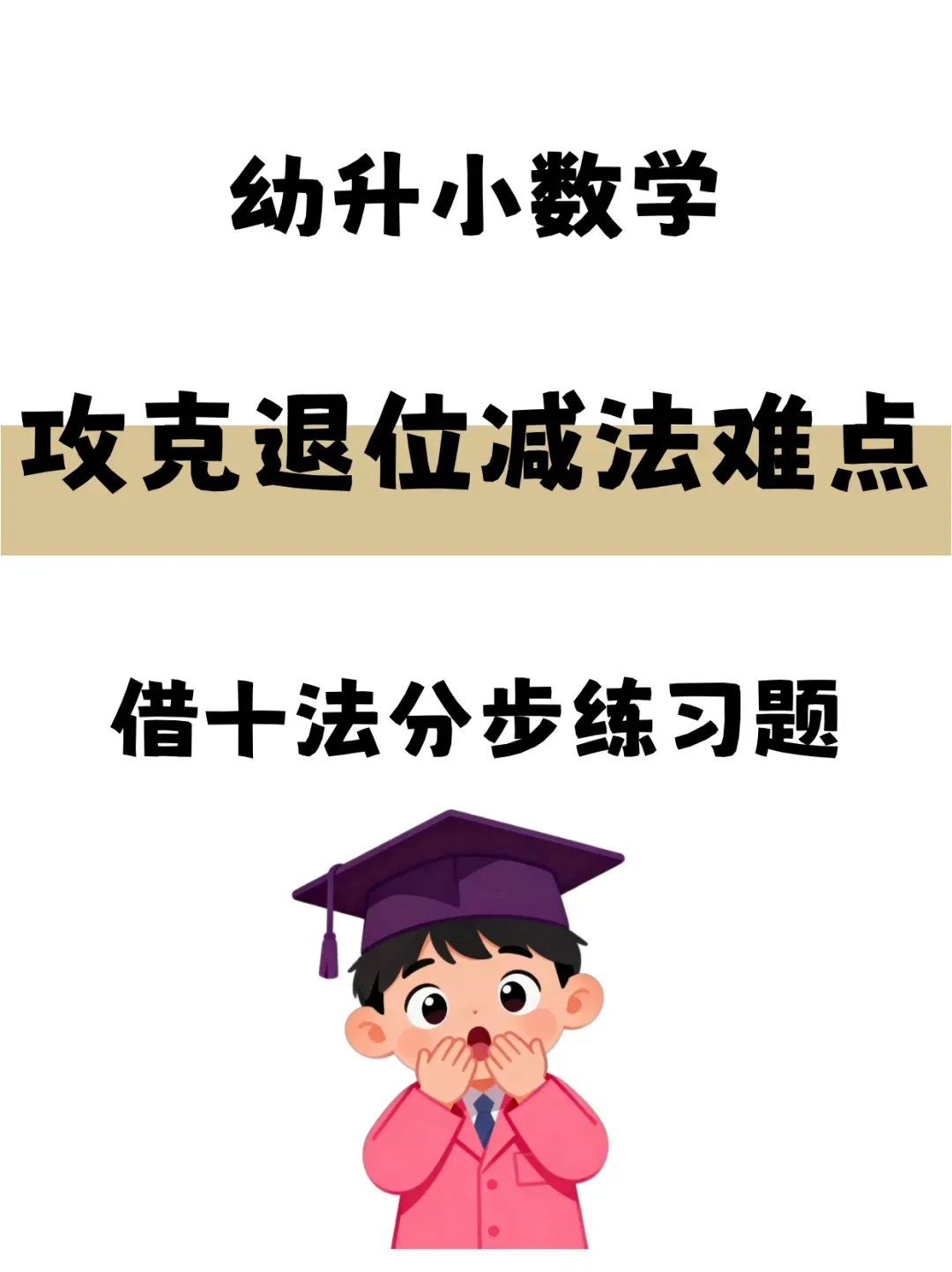 ✅核心亮点:专为幼升小孩子设计的借十法系统训练,从直观图示→分步拆解→独立计算,循序渐进夯实20以内退位减法基础,题型丰富、排版清晰、字号适中,保护低龄儿童视力
