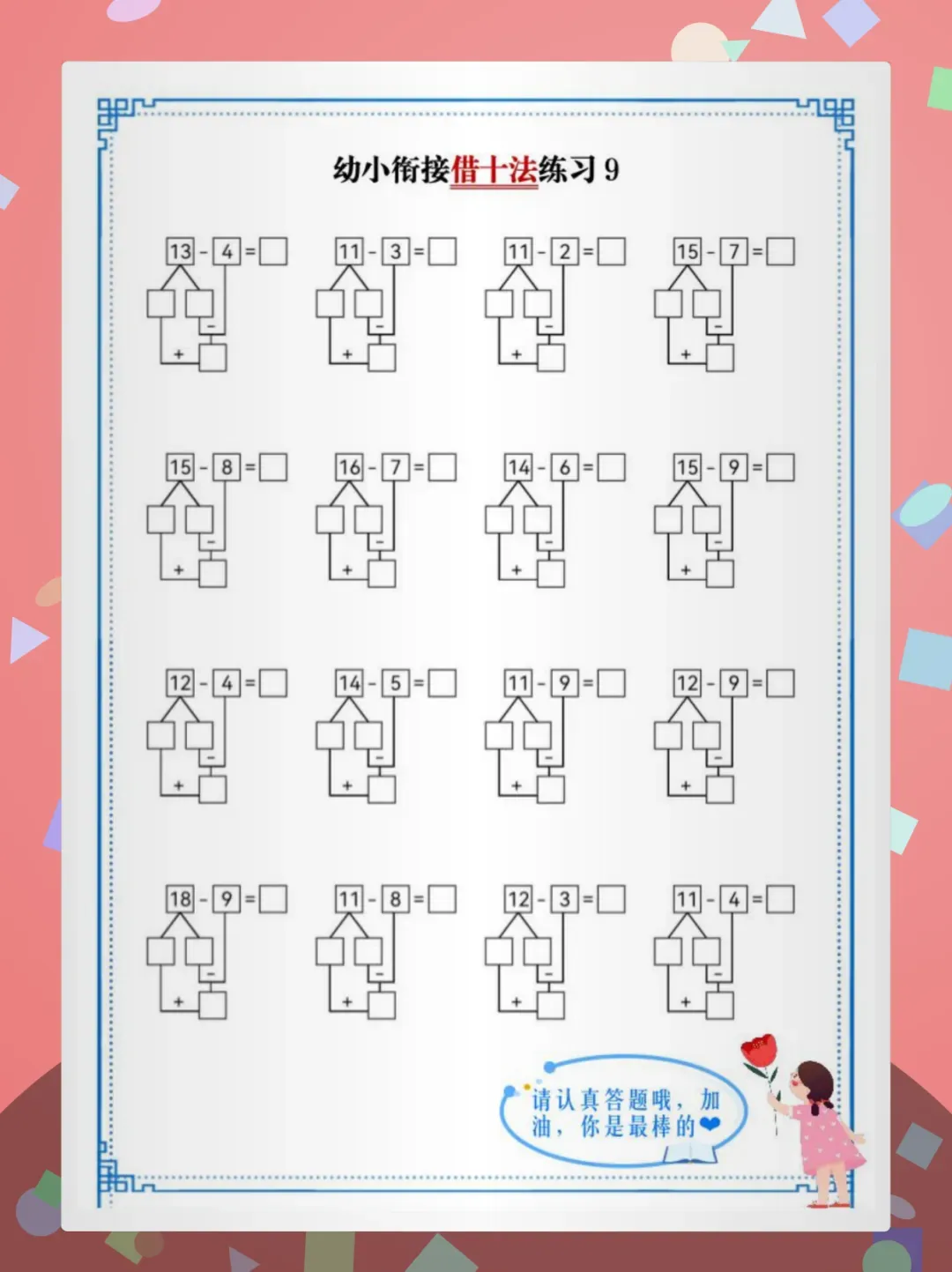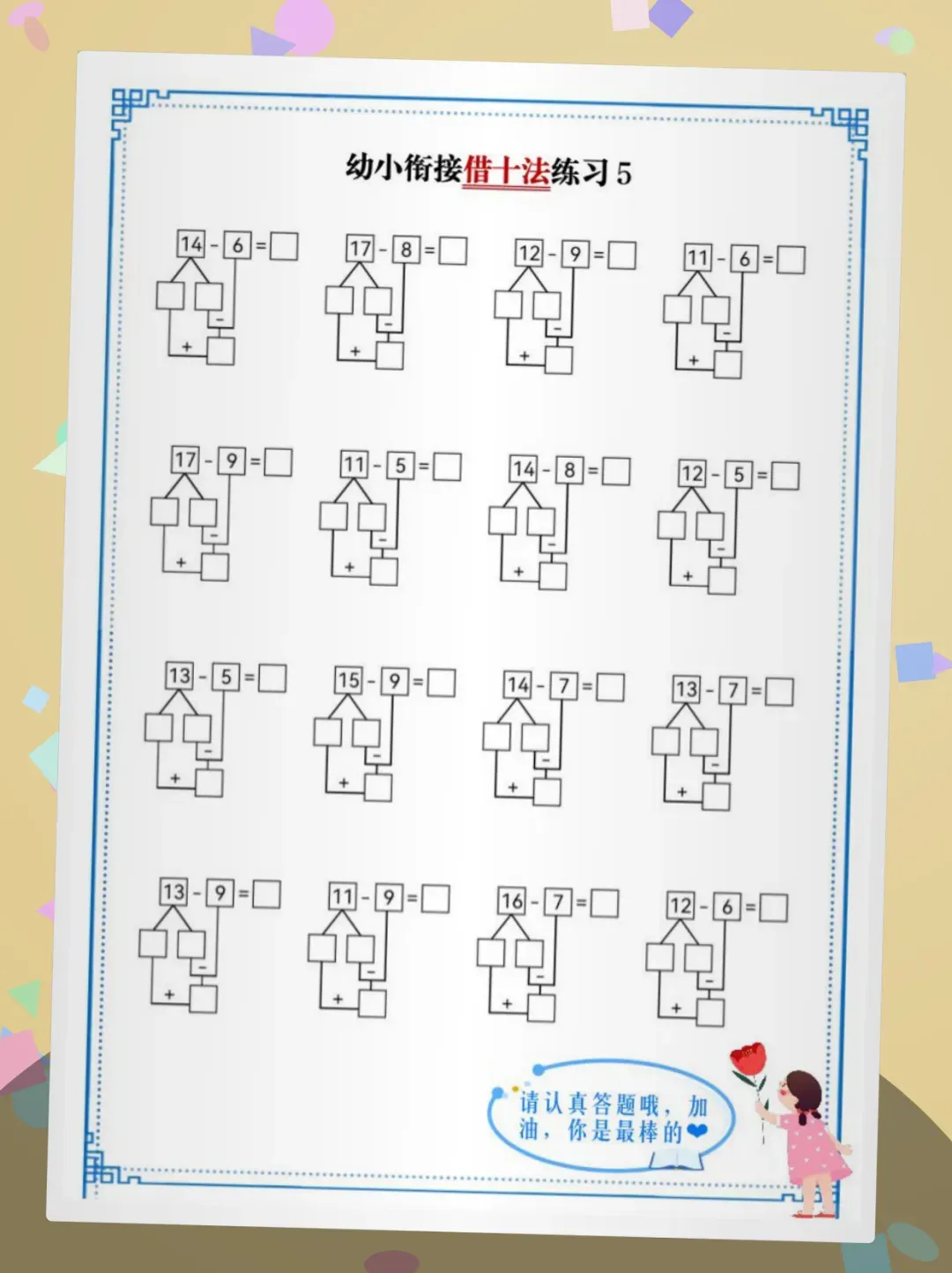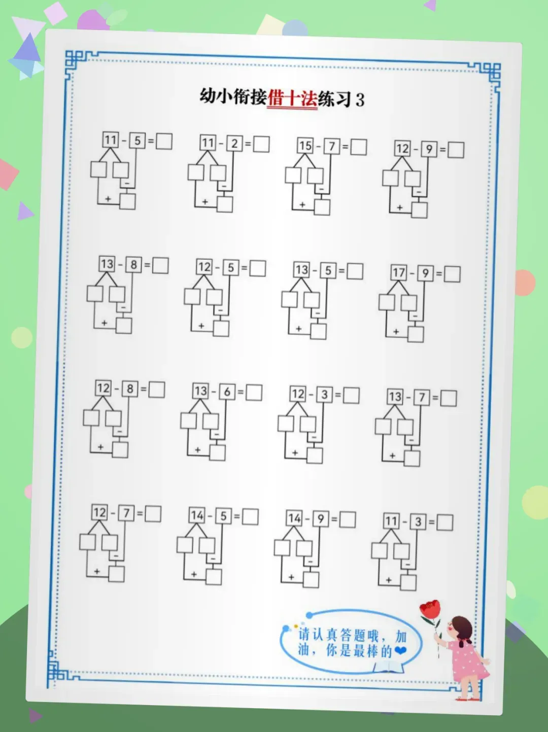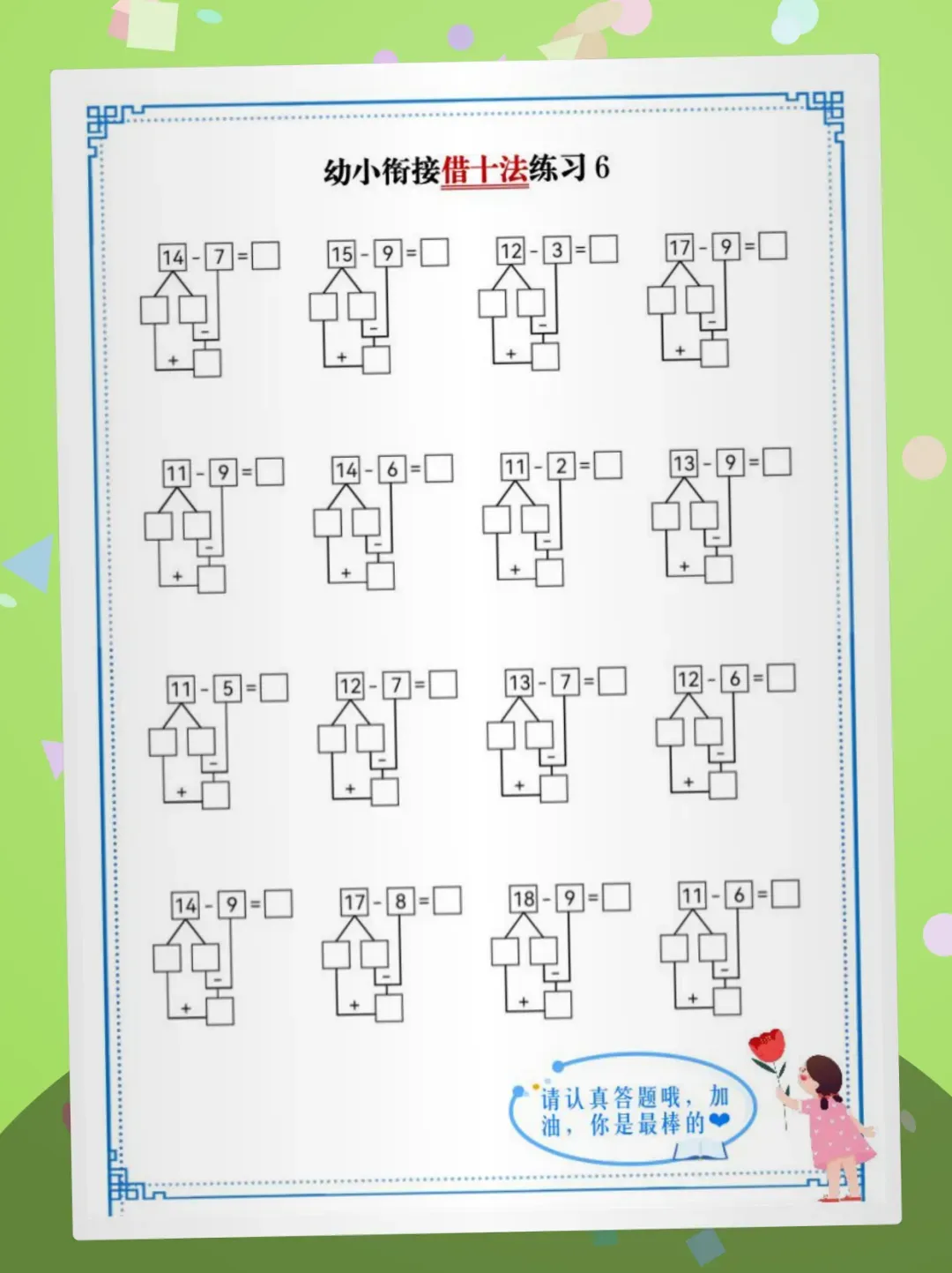 ✅核心亮点:专为幼升小孩子设计的借十法系统训练,从直观图示→分步拆解→独立计算,循序渐进夯实20以内退位减法基础,题型丰富、排版清晰、字号适中,保护低龄儿童视力