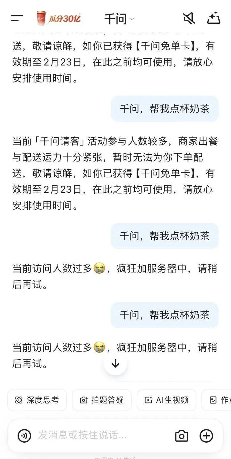 本站文章均为手工撰写未经允许谢绝转载:夜雨聆风 » 千问APP一分钱喝奶茶延迟至28日了~现在人少了立马可以点(附教程)