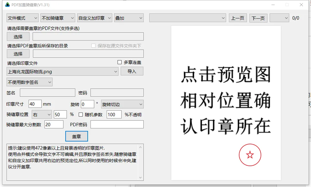 第三步:一键生成这是最爽的一步。 你可以选择“骑缝章模式”。软件会自动根据你的 PDF 页数,将印章完美切割。