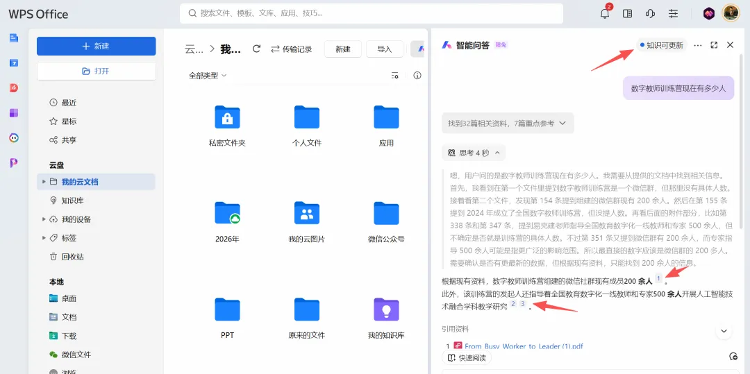 课件老师的问题是“数字教师训练营现在有多少人?”,WPS分别调用了课件教师云文档里的三个文件,分别是一篇微信公众号文章和两篇个人总结,里面提到了数字教师训练营教师的数量。