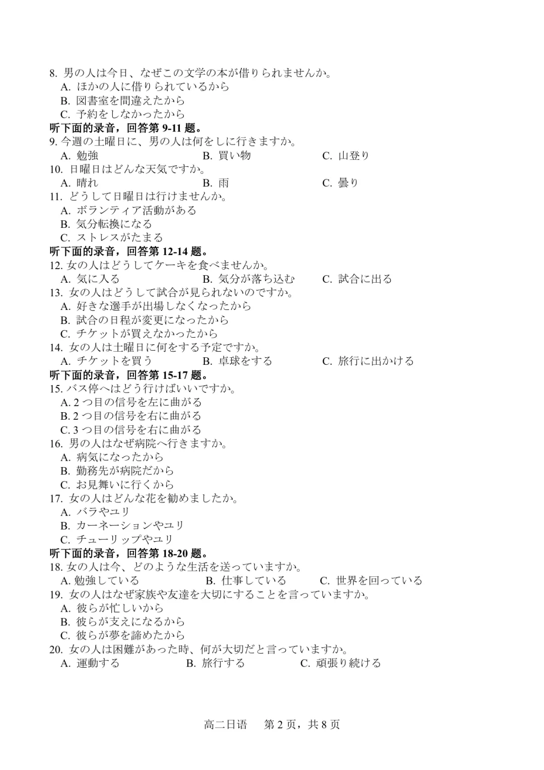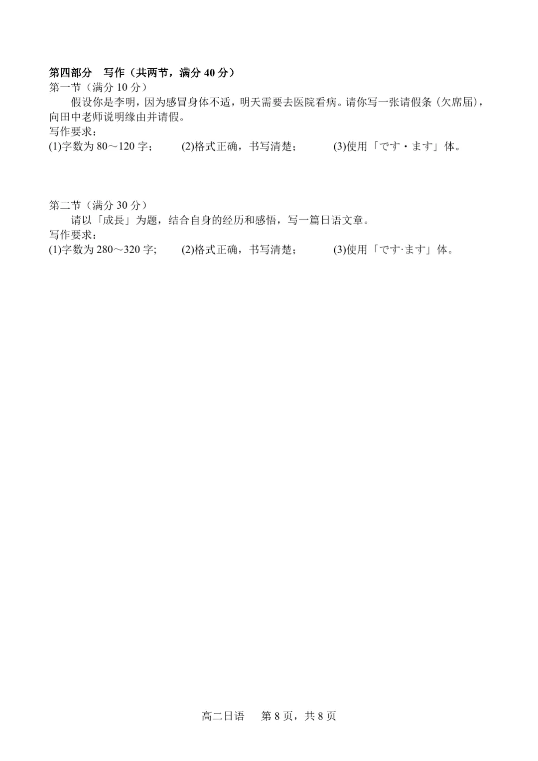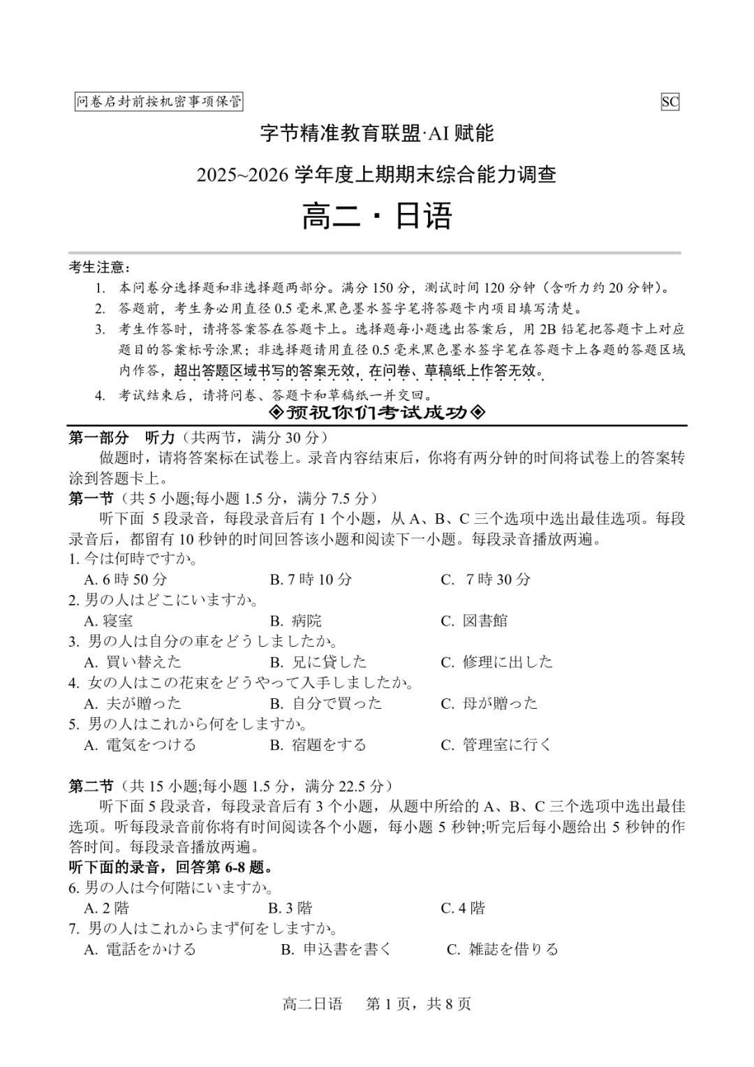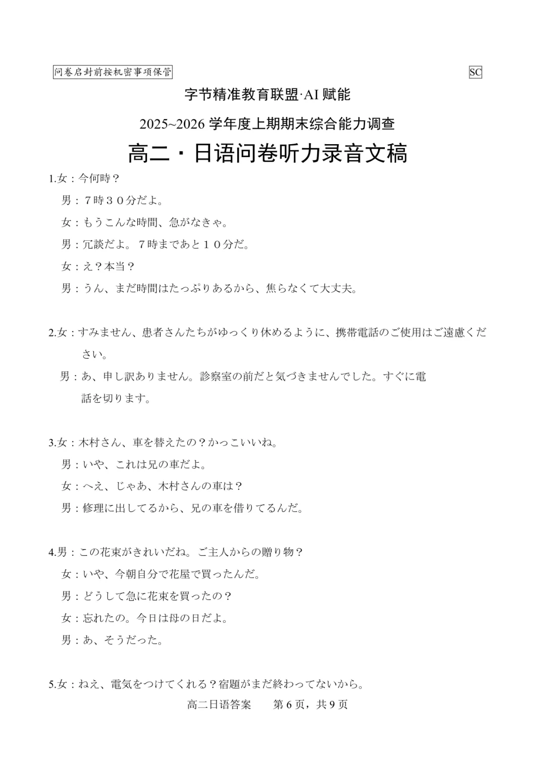 高二新听力日语word/PDF|四川字节精准教育联盟AI赋能2025~2026学年度上期期末综合能力调查高二日语试题-听力-答案-勇桑日语
