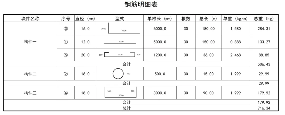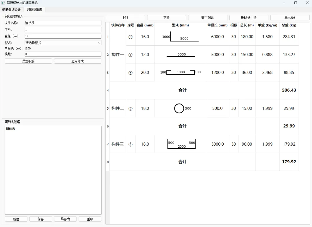 结构化明细表生成与管理:将设计好的钢筋型式与工程参数(直径、根数、所属构件等)结合,一键生成符合施工习惯的明细表,并可直接导出为PDF。