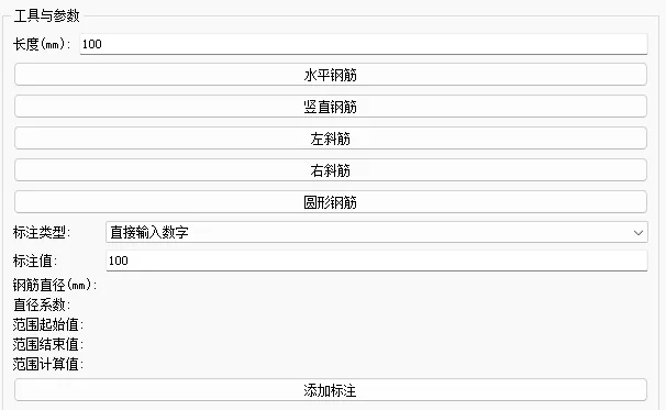 左侧控制区:所有工具的“控制台”。在此选择钢筋类型、设置长度、选择标注样式。
