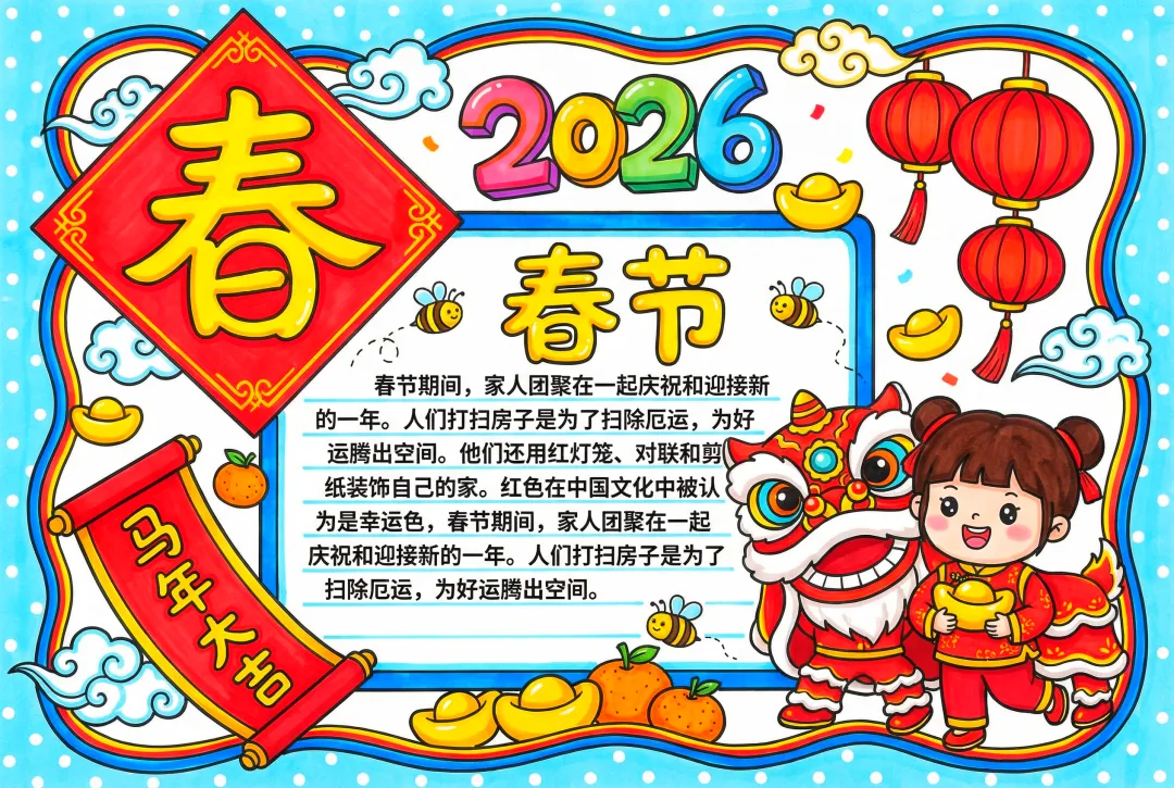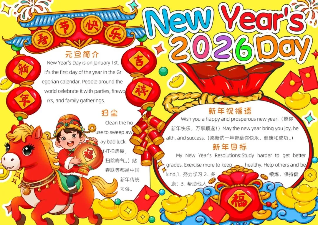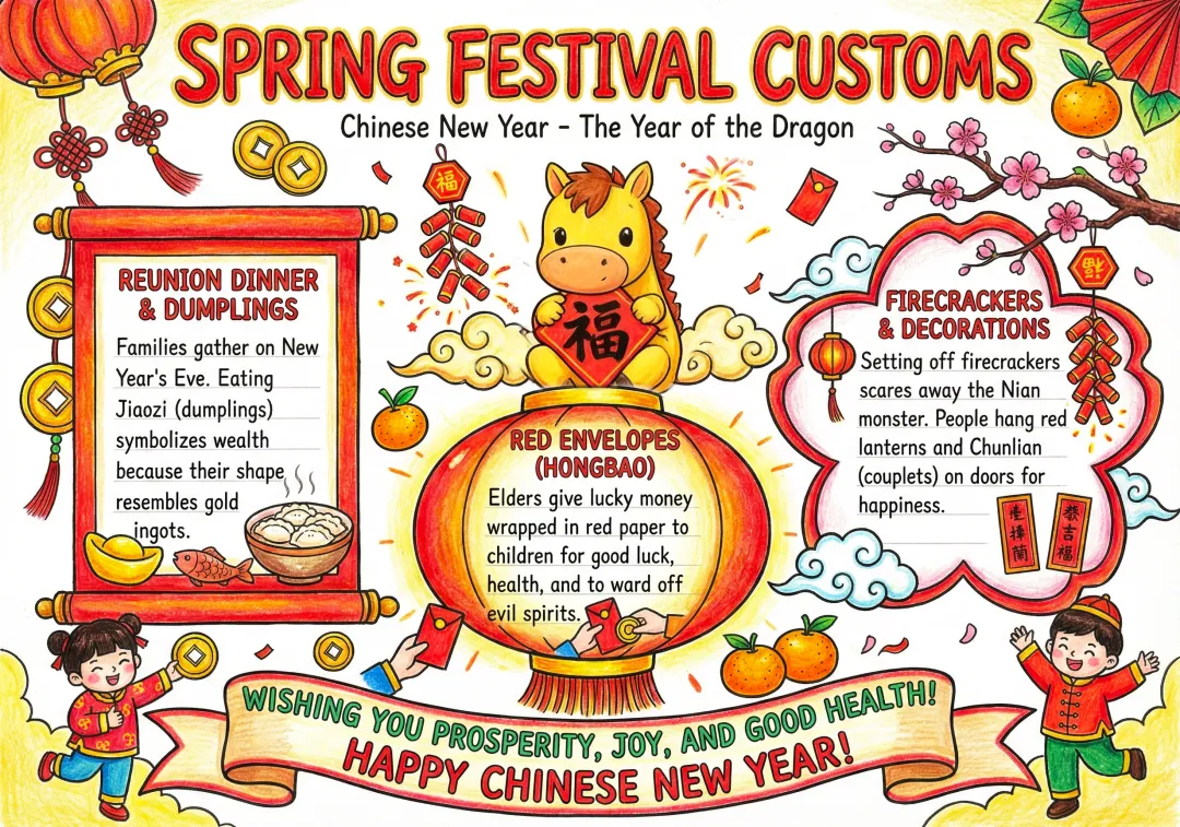 春节英语红色卡通新年英语小报手抄报春节手抄报新年