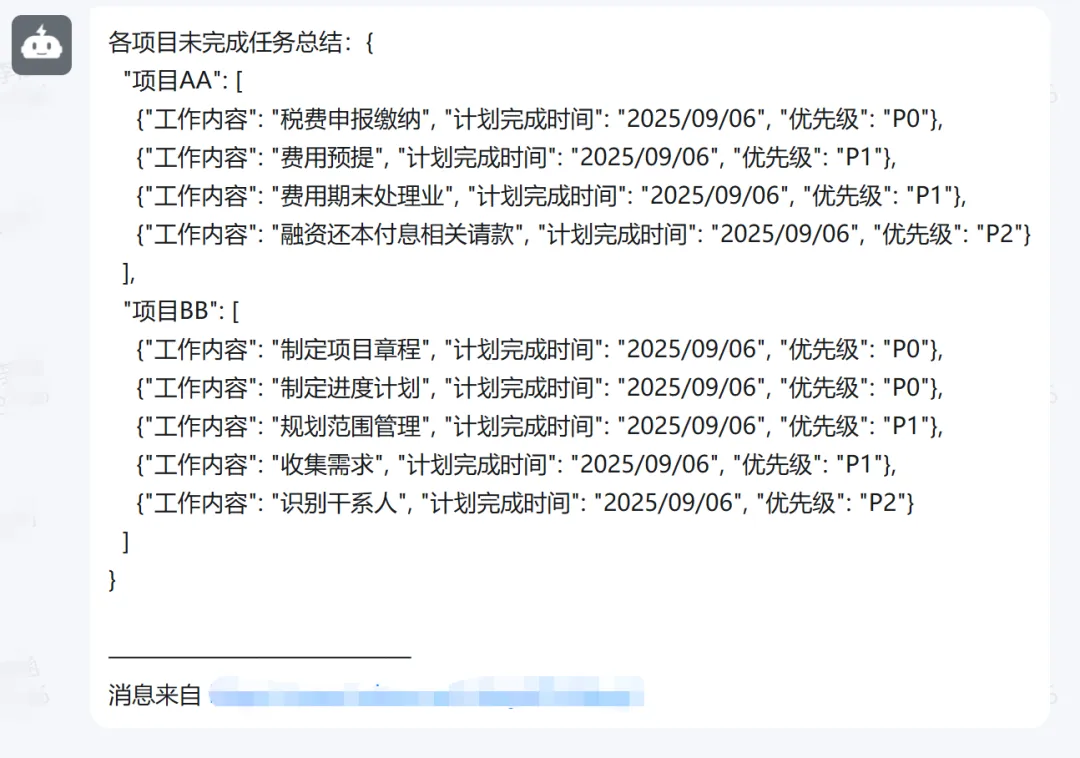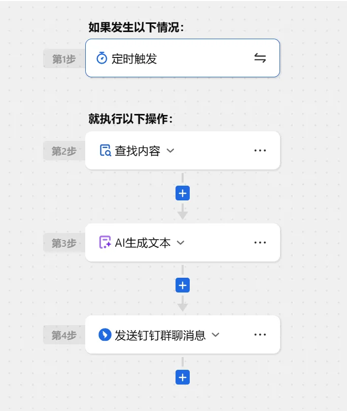 触发:设定定时触发条件(如每天18:00);输入:指定具体飞书数据表格,设置筛选条件,获取需要的数据范围;处理:将获取的原始数据,组合成简洁易读的消息文本(可包含日期、字段名、数值等关键信息);输出:通过钉钉机器人,将处理好的消息发送至指定钉钉群。