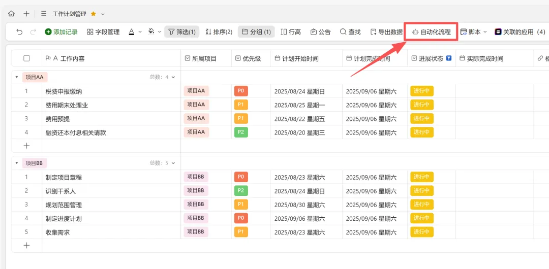 a.创建工作流:WPS多维表格下,点击‘自动化流程’;
