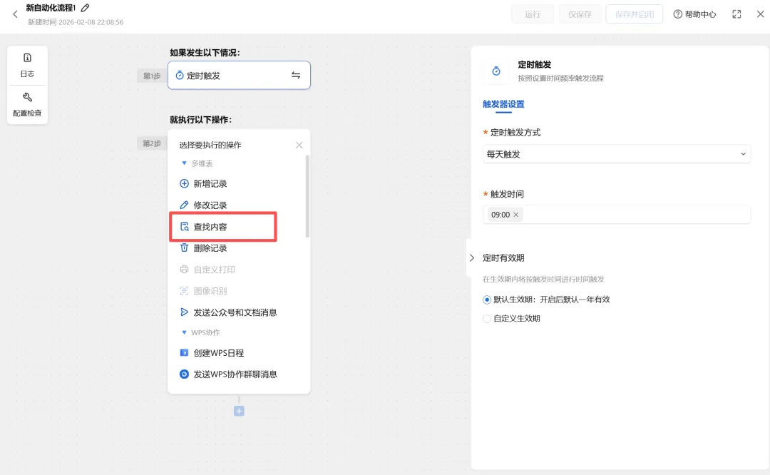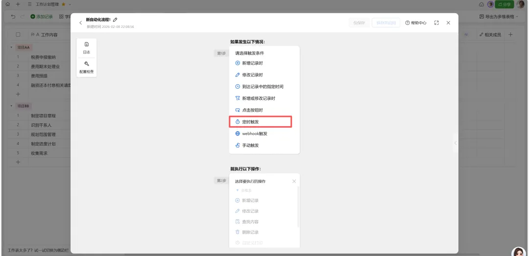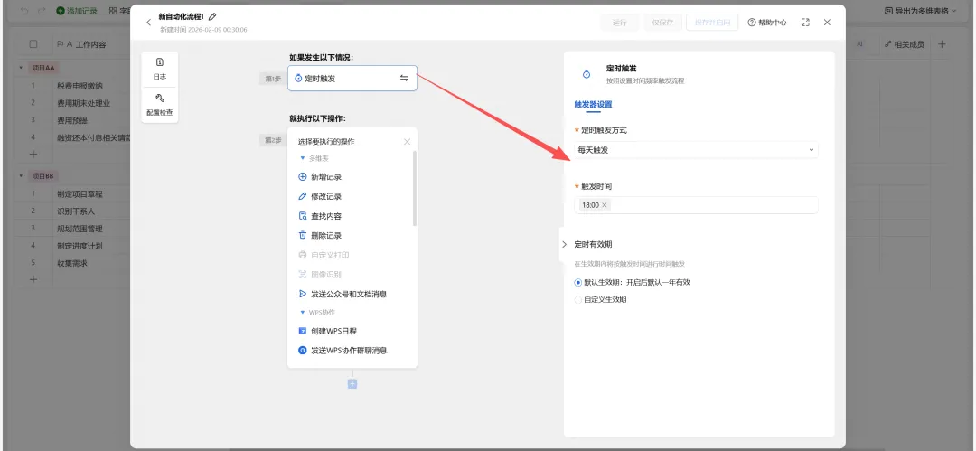 b.【触发】设置触发器:选择定时触发方式,按照第一步拆解的需求,设定具体触发时间(如每天18:00);