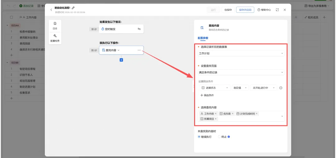 c.【输入】添加“执行动作”——获取数据:选择‘查找内容’操作,选定‘工作计划’表为具体查找表格,明确需读取的数据范围与字段信息;
