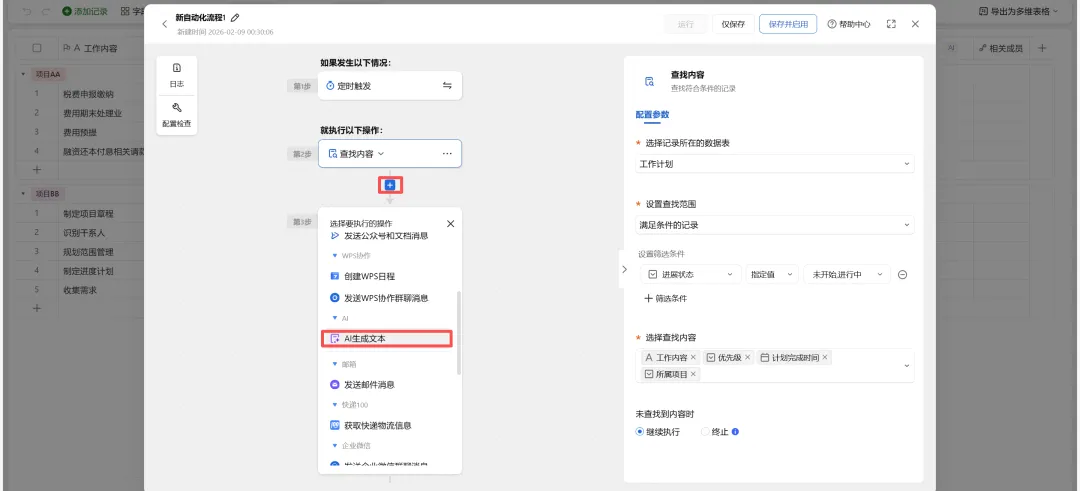 每天下午6点,将WPS任务管理表格中‘工作内容’、‘优先级’、‘计划完成时间’、‘所属项目’4个字段的数据总结汇总后,自动推送至钉钉项目群