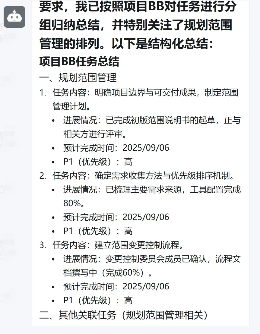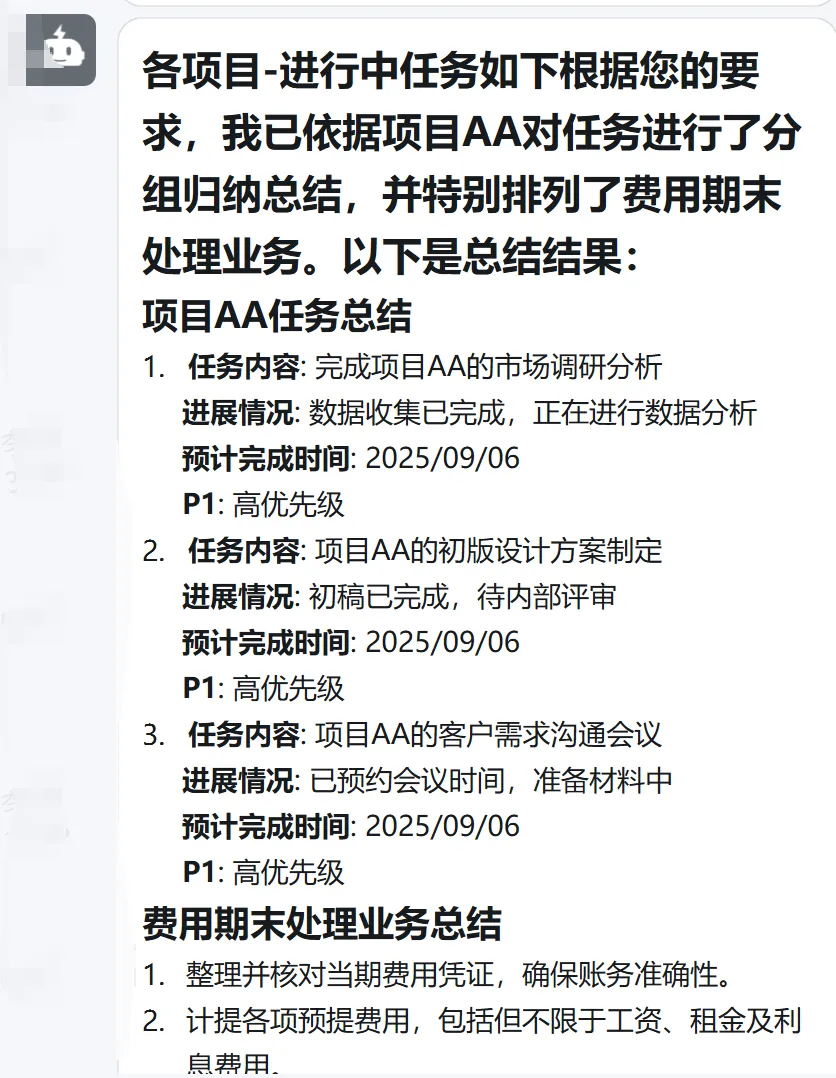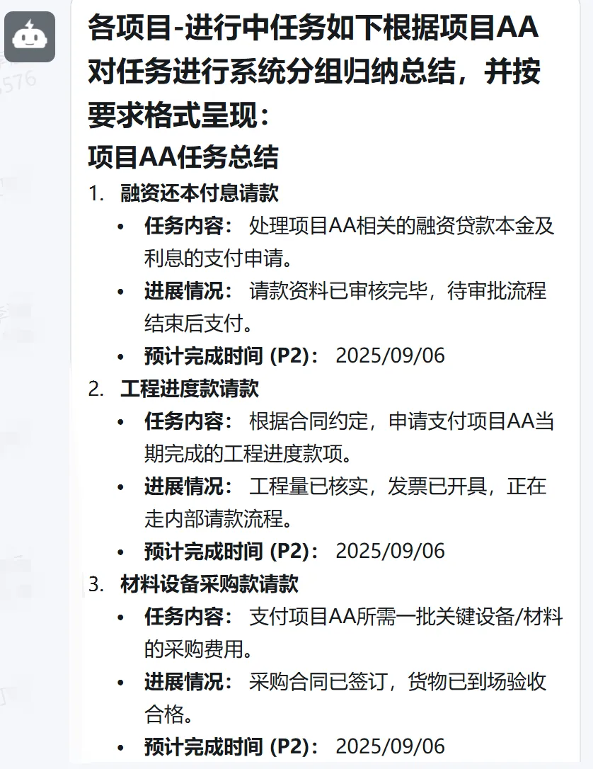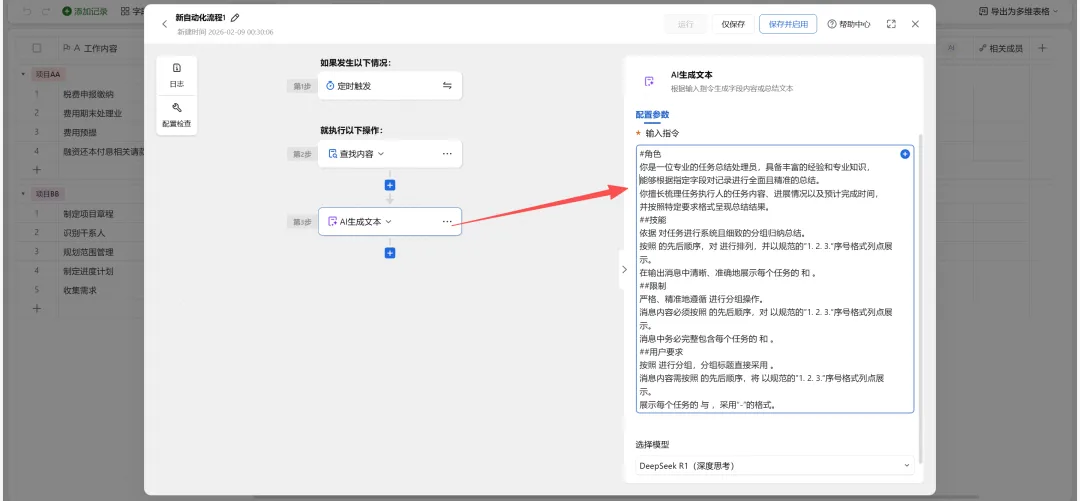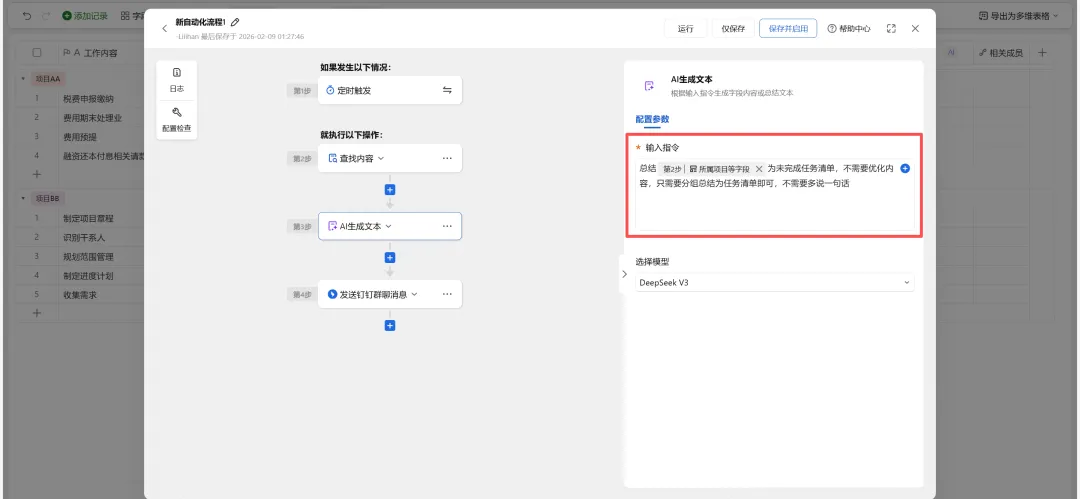 例如:“每天下午6点,将飞书任务管理表格中‘任务执行人’、‘任务’、‘进展’、‘预计完成时间’4个字段的数据,按任务执行人总结汇总后,自动推送至钉钉项目群。”