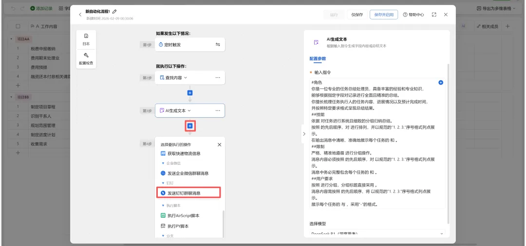 e.【输出】添加“执行动作”——发送通知:选择‘发送钉钉群聊消息’,填入机器人Webhook与signToken,在对应的“消息内容”字段填入第3节点【AI生成文本】处理好的消息内容,完成推送配置。