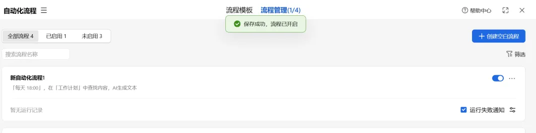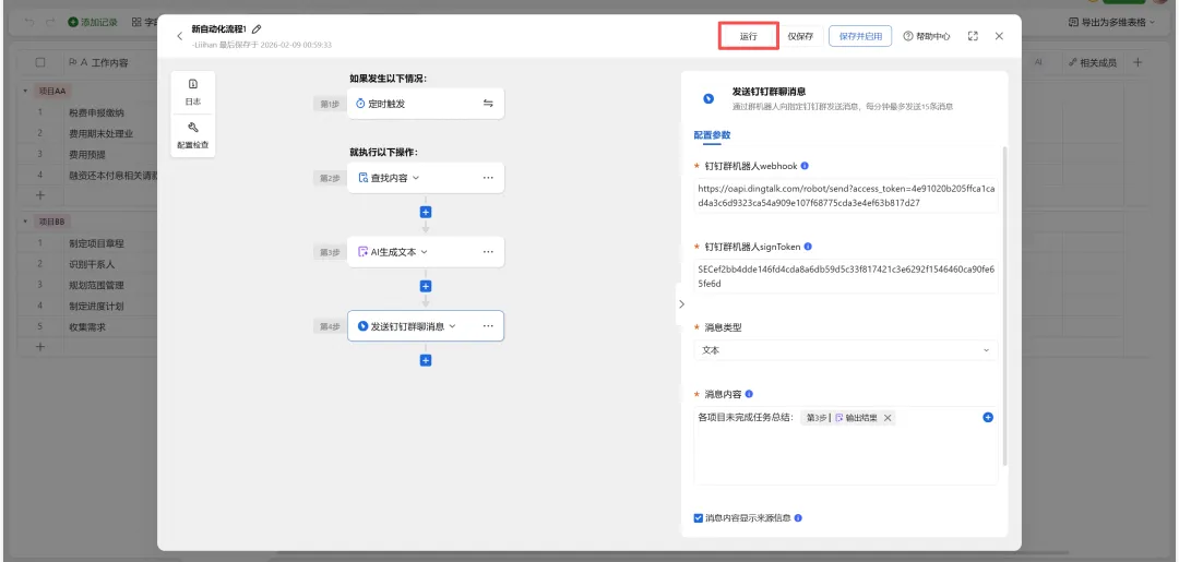 保存所有配置后,点击运行,检查钉钉群是否能正常接收消息,且消息格式正确、数据无误;