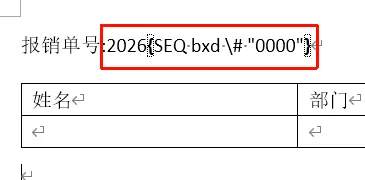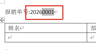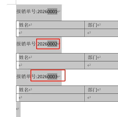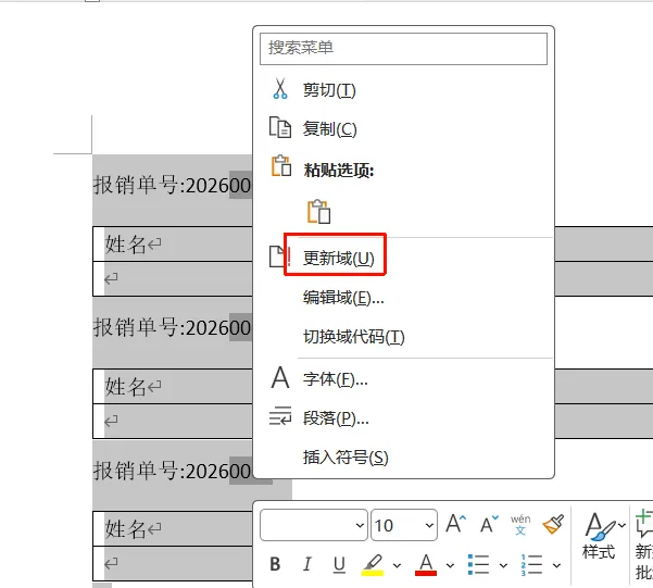 此时看到报销单号并没有变化。接下来,只需要ctrl+A全选,然后按F9,即可更新编号。当然,全选后,用鼠标右键中的“更新域”也是一样的效果。