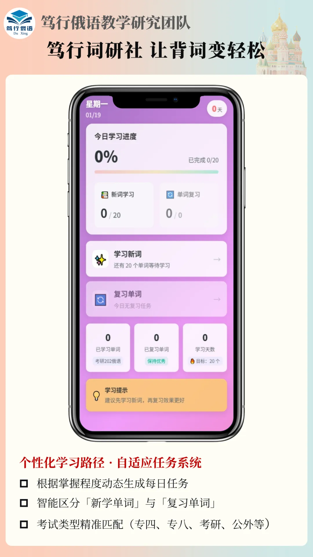 我们深知你的痛点,所以潜心研发,将“科学记忆算法”与“游戏化学习”深度融合,专为俄语考试(考级/考研等)打造了一款真正懂你的智能背词工具。