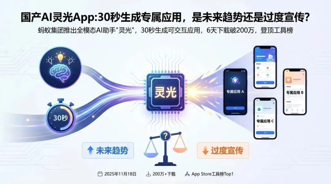 二零二五年十一月十八日,蚂蚁集团正式发布了名为“灵光”的全模态人工智能助手应用程序。这款应用主打的核心卖点是能够在短短三十秒内为用户生成具备交互功能的专属应用。自上线以来,“灵光”App表现抢眼,短短六天时间下载量便突破两百万次,并迅速登顶苹果应用商店工具类榜单首位。