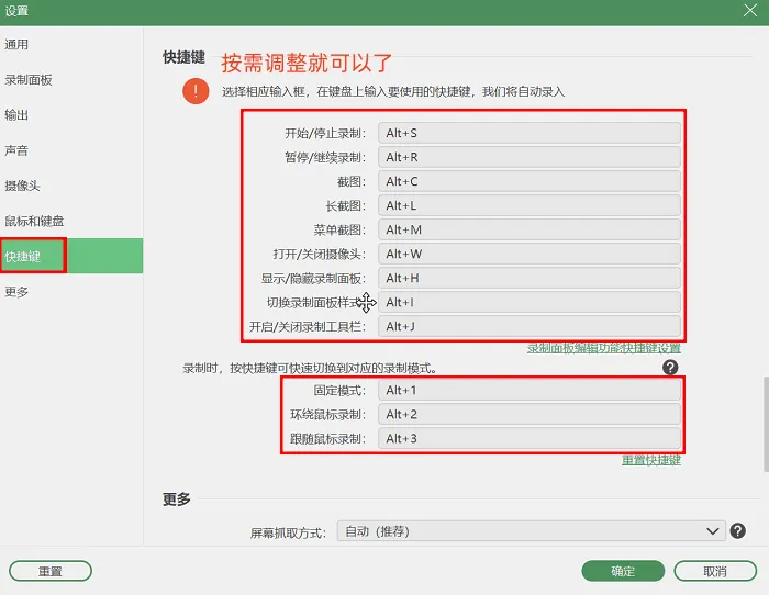 第2步:正式录制之前,软件会提示你进行录制范围与录制音频的设置,基础设置完成后,若存在特殊要求,可点击【快捷键设置】进行更细致的调整;