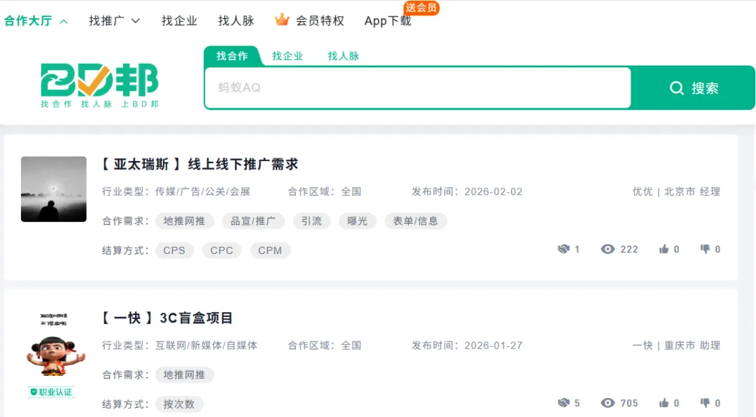 这类平台主要是对接异业合作、市场商务合作、资源置换、地推网推等BD合作的商务合作平台,帮助企业找合作项目、找人脉、找渠道等。
