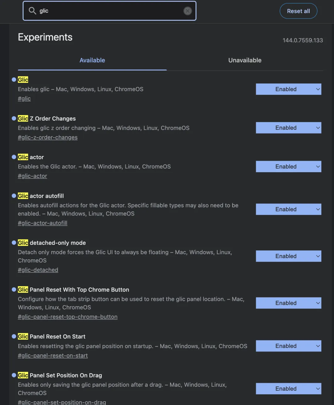 Glic,将所有以 Glic 开头的参数项(如Glic Button等)全部设置为 Enabled。