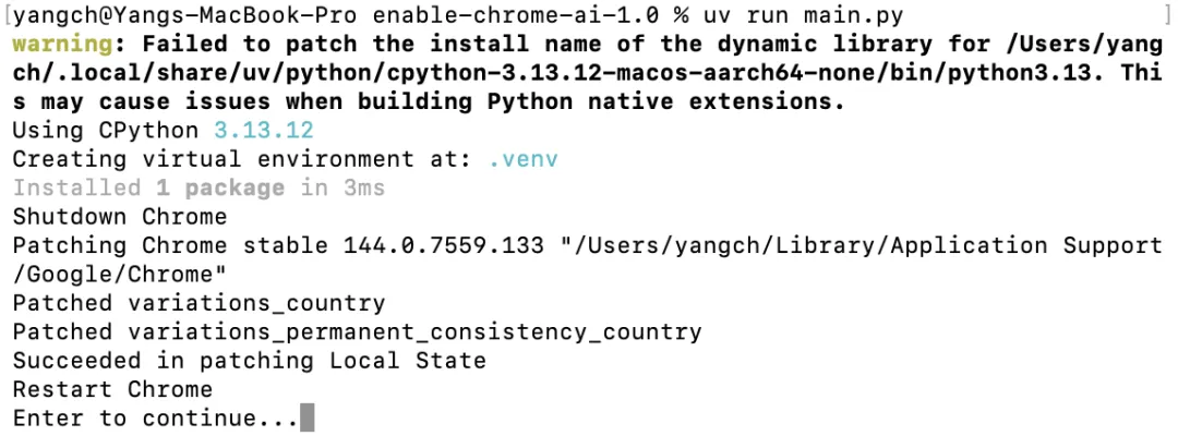 注意: 执行过程中脚本会自动关闭并重新启动 Chrome。当浏览器再次开启时,你会发现右上角出现了一个闪亮的 “Ask Gemini” 按钮!