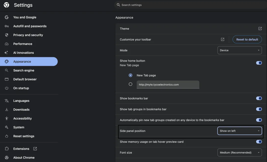 位置调整: 进入 Chrome 设置 -> 「外观」(Appearance),将 Side panel position 设置为 Left。这样原生 Gemini 窗口会出现在右侧,而传统的侧边栏在左侧,互不干扰。