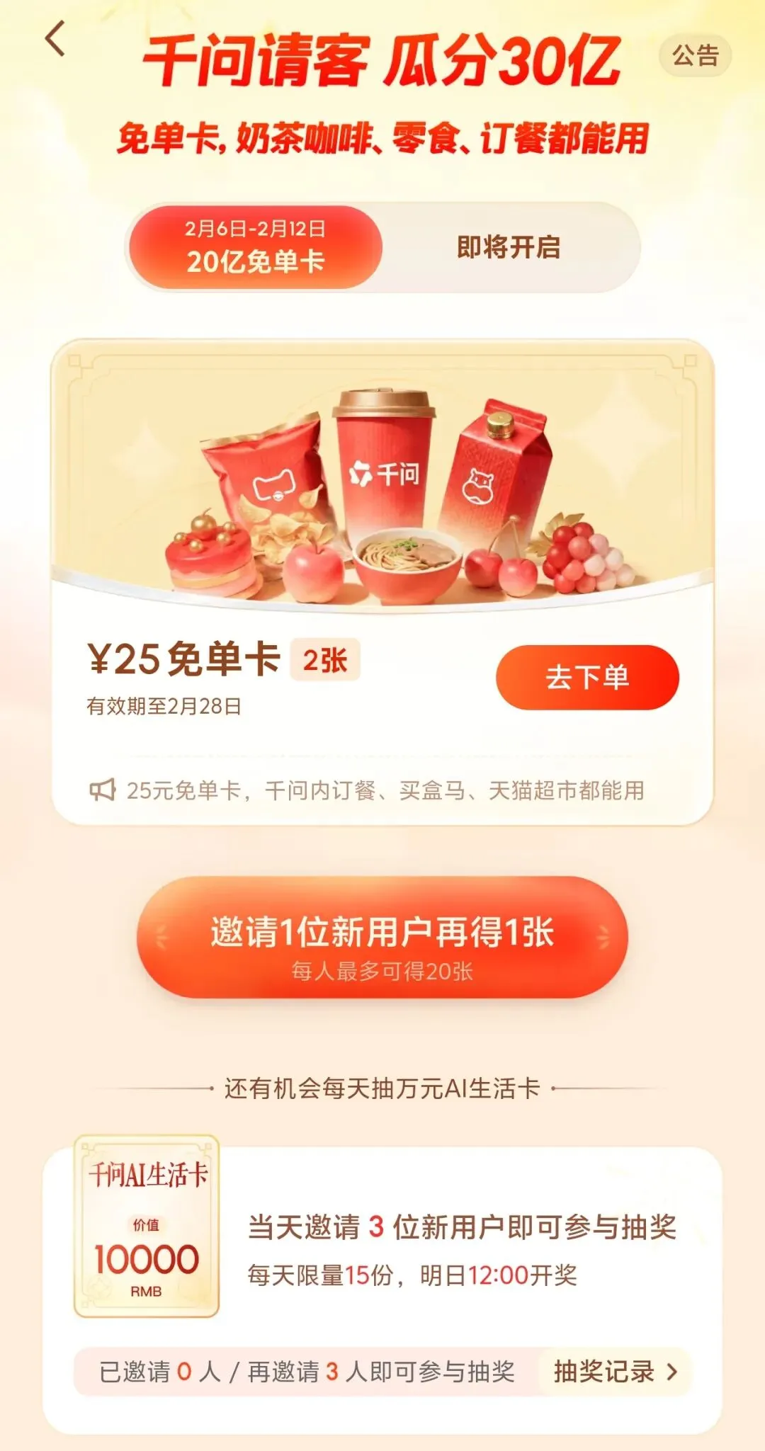 2月6日,千问APP正式启动“春节30亿请客计划”,活动福利堪称“诚意拉满”:用户下载或更新千问APP至6.0及以上版本,完成实名认证并绑定支付宝,即可自动领取1张25元无门槛免单卡;每邀请1位新用户注册,双方各得1张免单卡,单人上限20张;邀请满3位新用户,还能抽取价值万元的“千问AI生活卡”,涵盖全年免单权益。