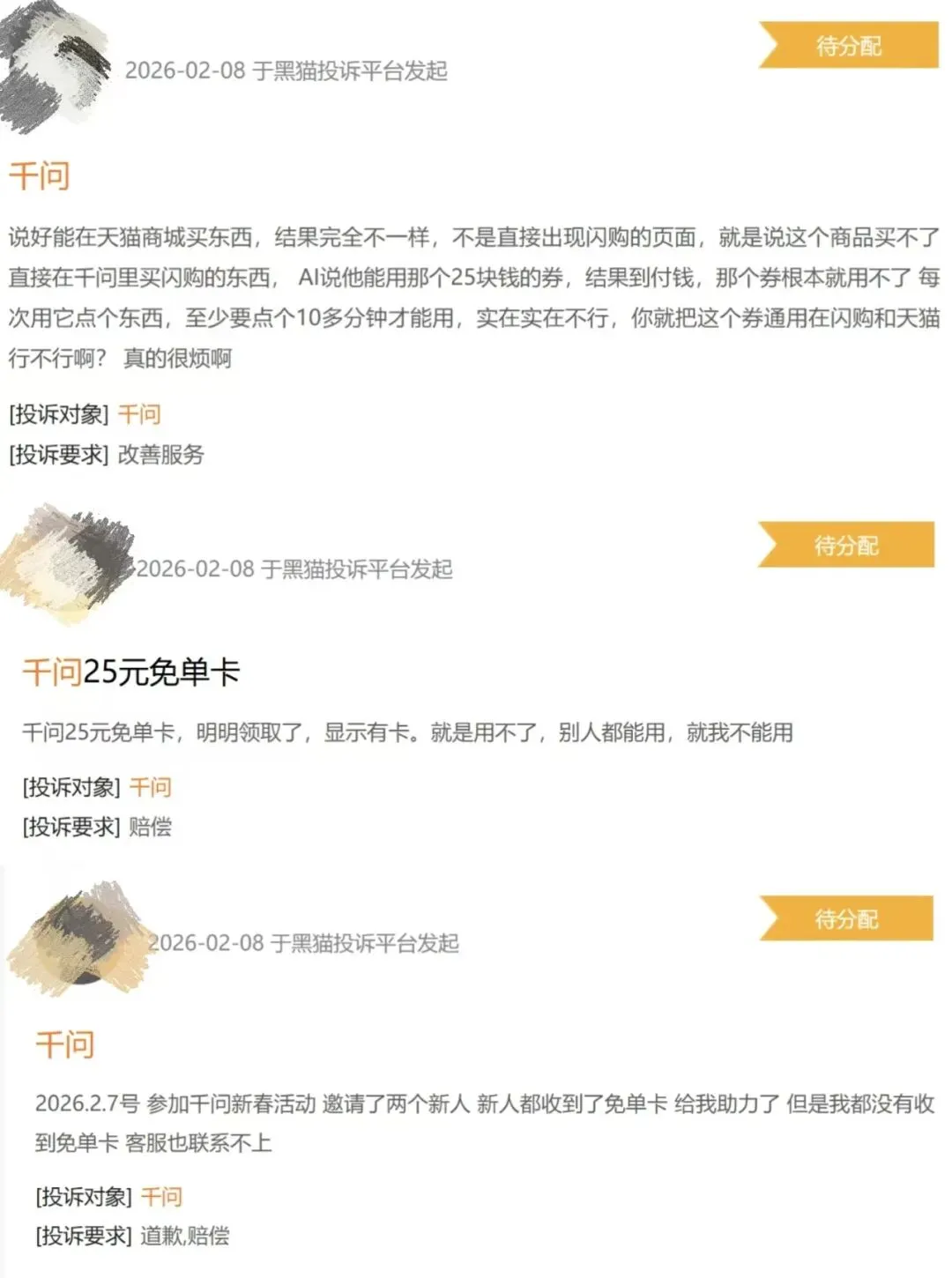 与此同时,用户投诉开始集中爆发:有用户反馈,千问APP宣传“下载必得25元免单卡”,但实际下载后不仅未领到免单卡,账户内自有红包还被无故消耗;有用户成功邀请多位新用户,后台显示已发放免单卡,但APP内始终无法查看、无法使用;还有用户联系客服反馈问题,却遭遇客服推诿,人工客服长期处于繁忙状态,甚至在用户明确告知白天无时间接听电话的情况下,仍频繁致电骚扰。据黑猫投诉平台显示,仅2月8日一天,关于千问APP虚假宣传、免单卡无法使用的投诉就达上百条。