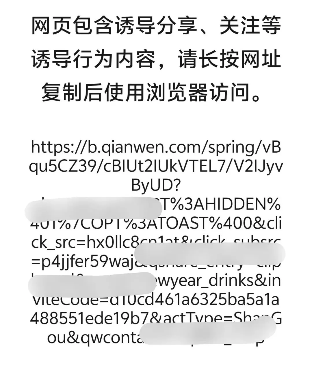 雪上加霜的是,微信开始全面屏蔽千问APP的分享链接——用户试图将千问的免单活动链接分享至微信好友或微信群时,页面会显示“网页存在诱导或误导下载/跳转的内容”,无法直接打开;随后,微信进一步升级限制,千问APP的分享口令在微信内无法正常复制,彻底阻断了千问通过微信进行社交裂变的通路,形成流量孤岛。