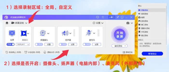 电脑免费录屏软件哪个好?优加蛙录屏软件支持Windows 7/8/10/11(32位与64位)和macOS 10.15以上系统,适配多数主流电脑配置,老旧机型也可稳定运行。软件提供7种专业录制模式,分别是全屏、区域、游戏、摄像头、窗口、围绕鼠标和计划任务。游戏模式的智能抠图功能可精准分离人物与背景,无需传统绿幕辅助;计划任务功能允许预设录制时间,例如凌晨的会议可设置自动录制,无需人工值守。