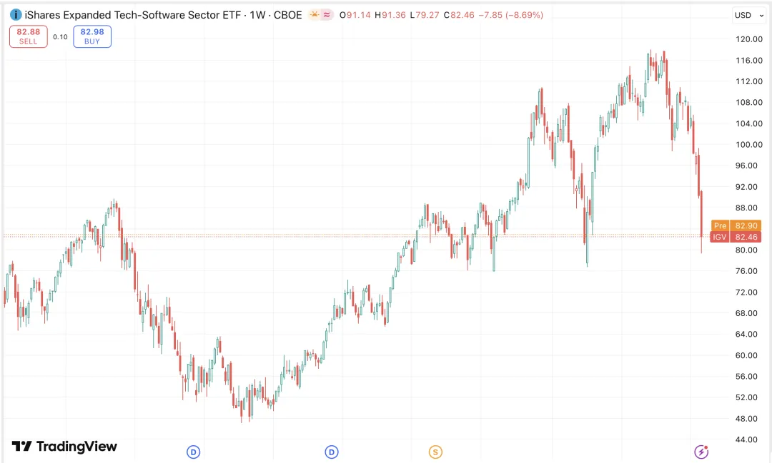 最后是客户对碎片化软件的清洗,既然一个超级模型能整合数据并搞定写代码、做图、客服等80%的工作,企业倾向于将预算从购买十几个垂直SaaS软件转向购买算力和模型,这将导致Salesforce退化为数据库、专业设计软件失去授权对象、独家数据整理价值被稀释,昔日长牛的软件ETF($IGV)恐将沦为装满旧时代遗物的博物馆。