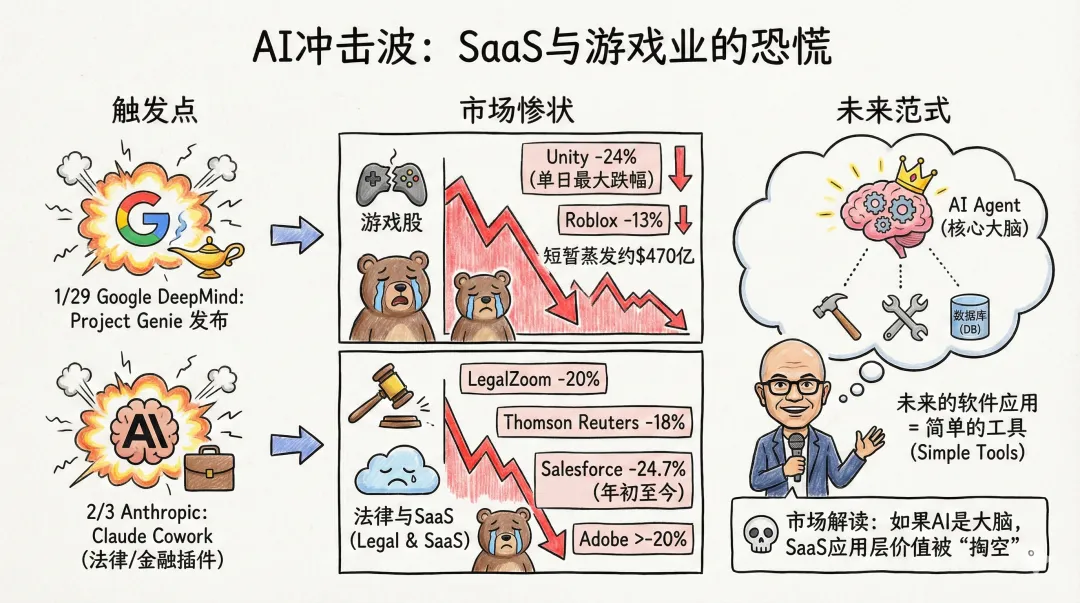 1月29号,Google DeepMind发布了Project Genie。当天Unity暴跌24%,创下了2022年以来最大单日跌幅。Roblox跌了13%。游戏股短暂蒸发了约470亿美元。