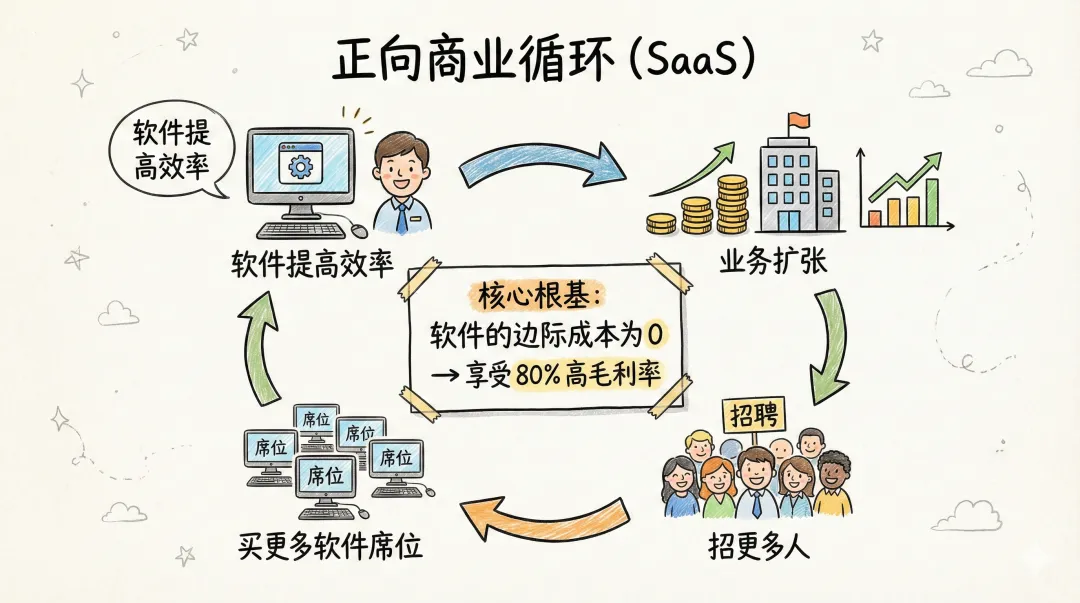 正向循环是这样的:软件帮员工提高效率,效率提升带来业务扩张,扩张需要招更多人,更多人需要买更多软件席位。这是很多SaaS公司能享受到80%毛利率的根基(因为软件的边际成本为0)。