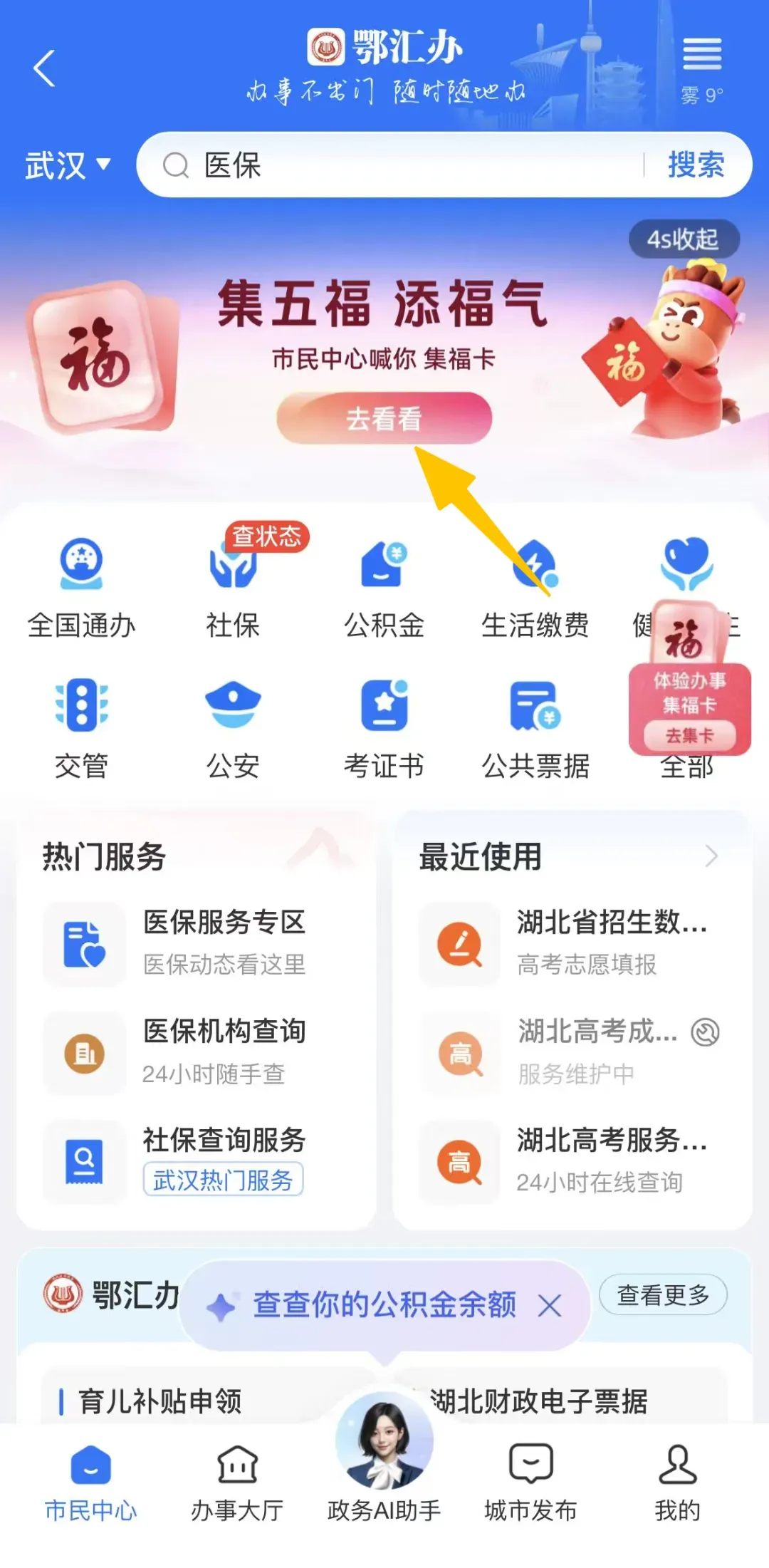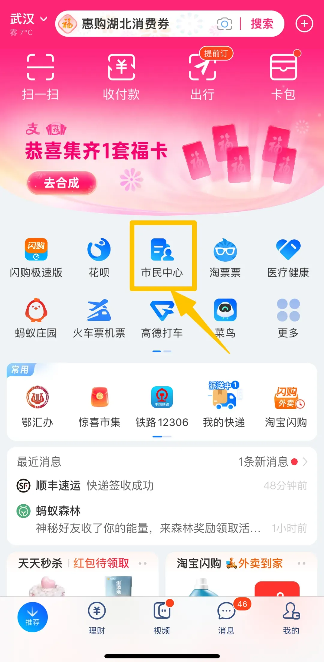 打开支付宝,点击进入市民中心首页参与集福卡。