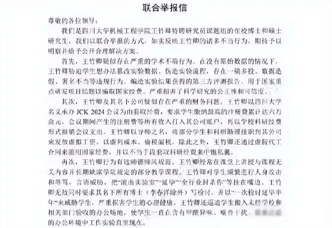 2026年1月16日,四川大学机械工程学院几名硕士和博士生联名发出一份83页实名举报信,他们直接指出导师王竹卿长期存在学术造假行为、滥用科研经费,还经常对学生态度恶劣,举报材料里包含邮件截图、录音记录、银行流水和实验数据对比,这些证据一条接一条呈现出来,不是那种随便编造的匿名内容,事件很快传播开来,大家发现这次情况和以往不同——学生们没有选择回避,而是公开站出来表明立场。