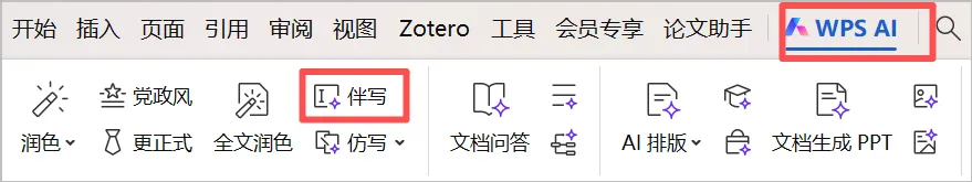 普通入口:顶部 「WPS AI」选项卡里,开启「AI伴写」开关。
