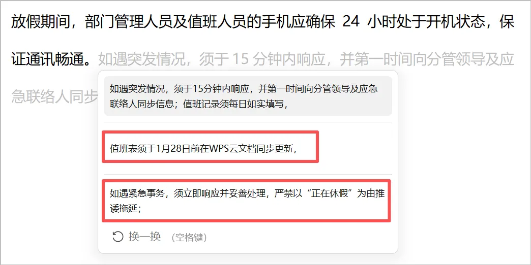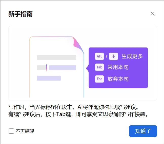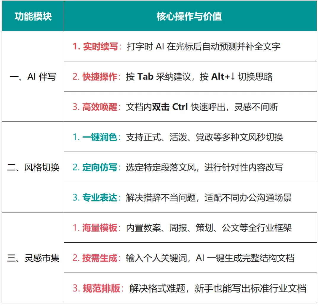 核心妙用:你一边打字,它一边在光标后面用浅灰色字给你“出主意”,根据文档已有内容,实时智能续写文字,减少手动写作耗时