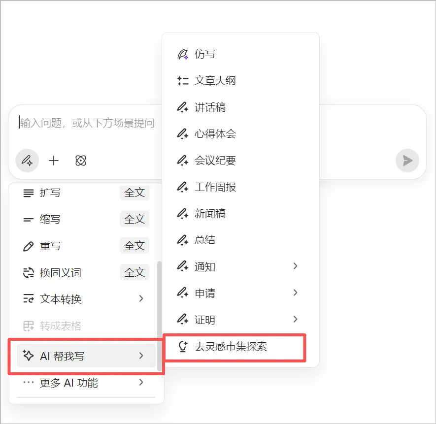 快捷唤醒:双击Ctrl,唤醒WPS AI对话框,下滑选择「AI帮我写」,点击进入「去灵感集市探索」