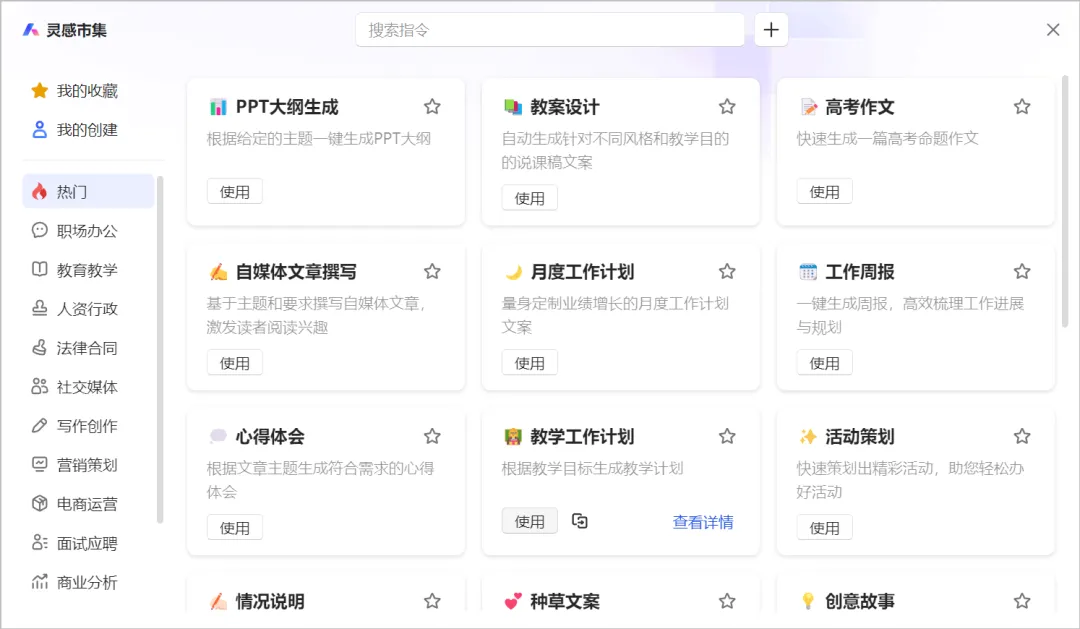核心妙用:全是现成的模板。比如要写“教案”、“工作周报”或“活动策划”等