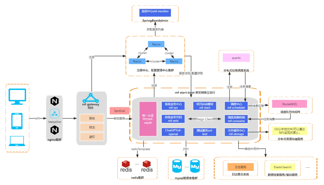 后端基于SpringBoot4, Spring Cloud Alibaba,实现微服务、单体服务代码一体化架构。前端采用VUE3+AntDesign。注册中心、配置中心采用nacos(作为单体服务时无需使用注册中心)。支持oauth2统一认证接入,支持多种登录方式(账号密码登录、手机短信登录、微信扫码登录)。支持租户切换,租户可以自己管理自己的人员、组织、角色。支持可视化配置查询API接口,后端自动生成SQL执行。支持注解方式进行数据权限控制,与业务代码完全解耦