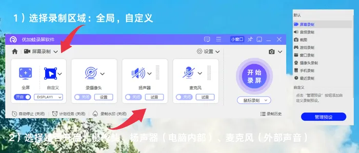 免费好用屏幕录制软件?优加蛙录屏软件提供全屏、自定义区域、窗口、游戏、音频、摄像头画中画等多种录制模式,适配多场景使用需求。
