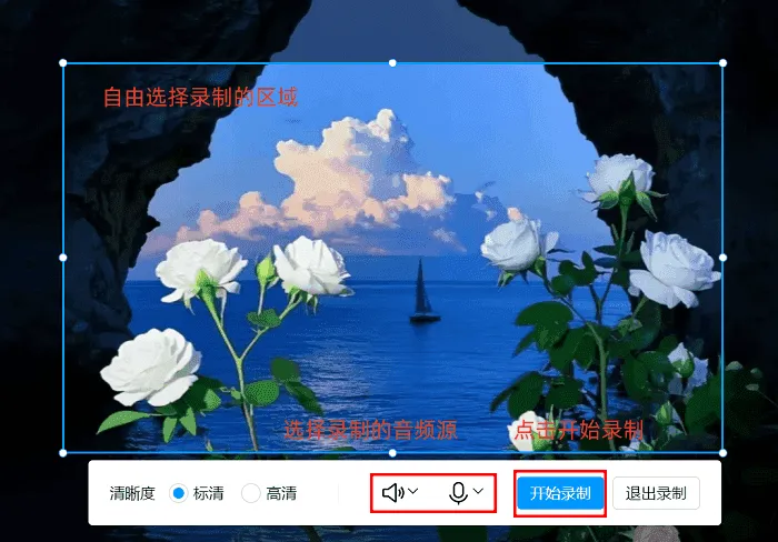 第二步:进入录制前配置页面,用户可根据自身需求设置录制范围大小和音频选项,若需更个性化配置,点击上方【设置】按钮调节输出尺寸与格式;参数全部调试完毕,点击【开始录制】按钮启动;