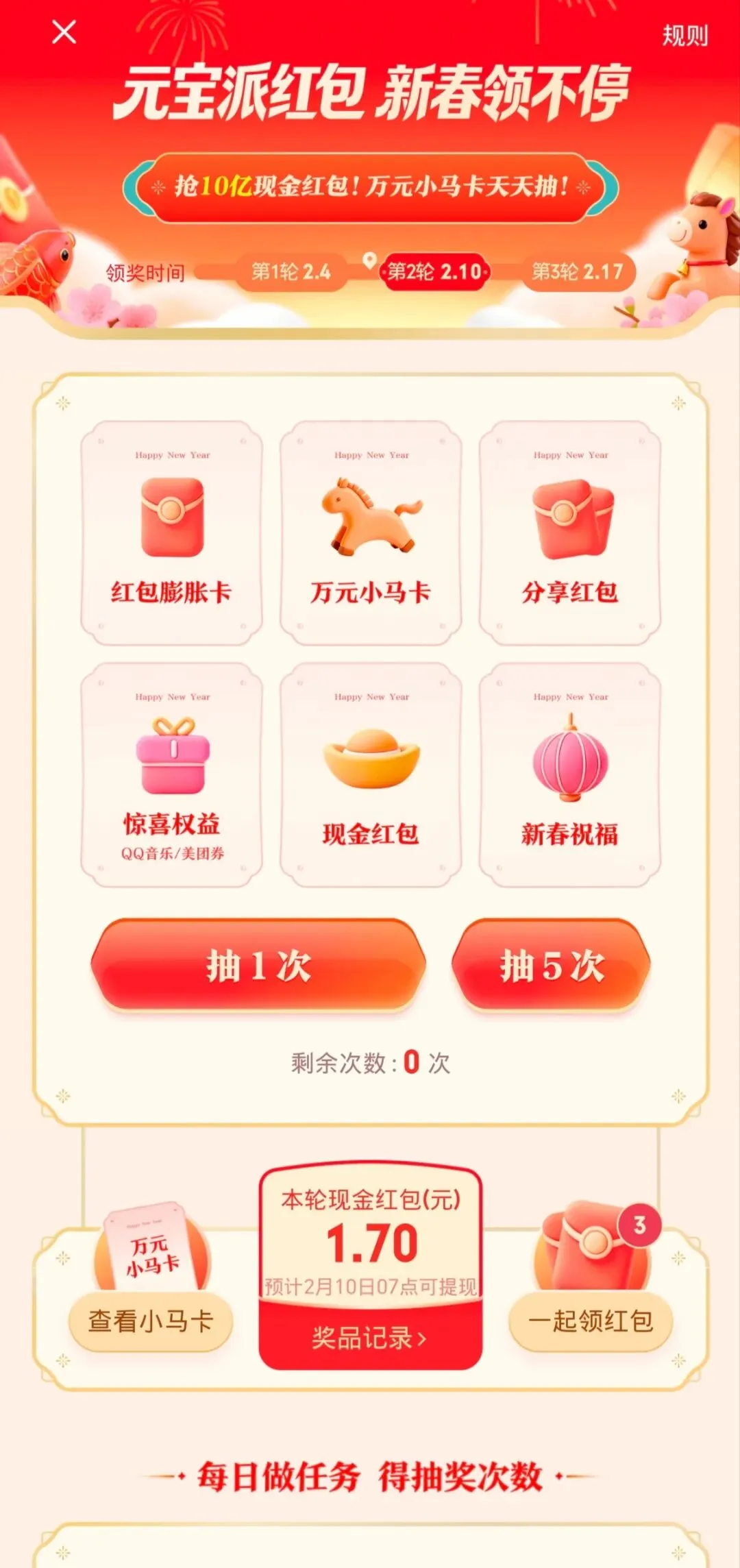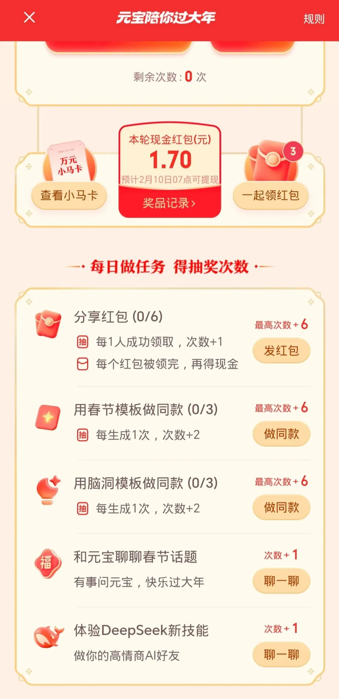 – 做任务抽大奖:完成AI互动、内容浏览、活动分享等任务,就能解锁抽奖次数,既有普通现金红包,还能抽限量100张的「万元小马卡」