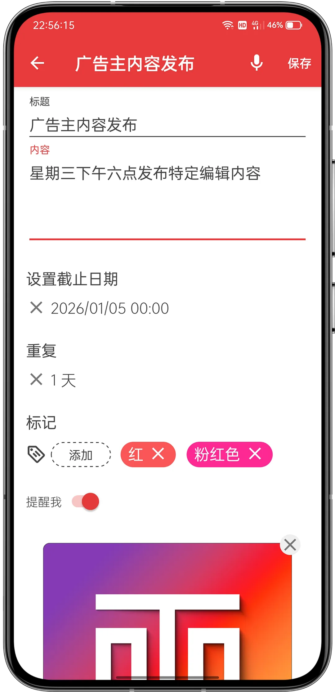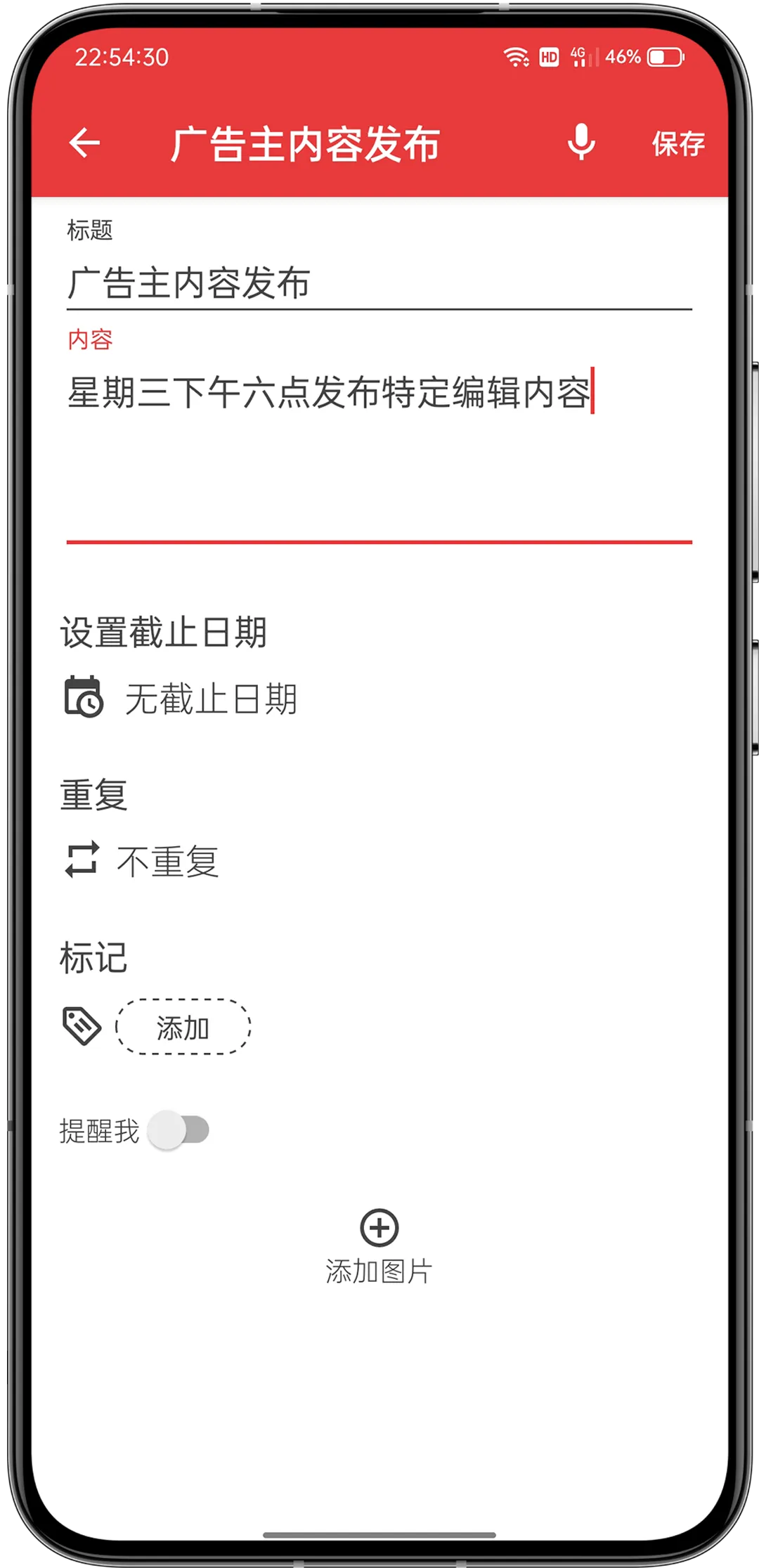 分别填写待办事项的标题以及具体的内容,如果不需要设置提醒的时间,点按右上角的 “保存” 保存就可以了;如果是需要设置提醒,在 “设置截止日期” 设置具体提醒的时间。